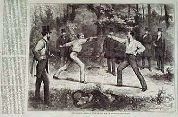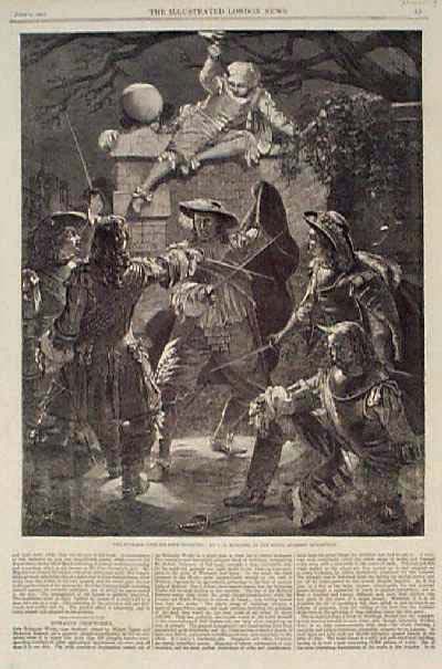 ![]() 002fen: 1860 Fencing: Duel Scene. Woodcut engraving from the July 14, 1860 Illustrated London News, titled "The Outrage Upon Sir John Coventry." Based on a painting by T.H. Maguire, which was being exhibited in London at the time. 11x16 in. $30 ![]() 010fen: 1874 Fencing Scene: Sword vs. Bayonet. Antique hand colored engraving from Harper's Weekly, titled "An Assault a Arms: Sword Versus Bayonet." Shows two men in fencing uniforms, dueling before a crowd of onlookers. 11x16 in. $50 Black & White: $40 ![]() 011fen: 1892: The Fencing Master. Hand colored, engraved scenes from a play titled "The Fencing Master." Contains an image of a fight scene, and views of several characters in the play. Published in an 1892 issue of Harper's Weekly. 11x16 in. $50 Black & White: $40 ![]() 012fen: 1917 Fencing Underwear Ad. Full-page ad for Varsity Union Suit underwear, featuring an underwear-clad man holding a sword in a fencing position. Text of the ad states that Union Suit is the "Active Man's Underwear." 10x14 in. $30 ![]() 013fen: 1864 Fencing: Wounded Man After Fight. Engraved image from the Illustrated London News, titled "After the Brawl." Shows a wounded man lying on the floor, with his sword-wielding opponent standing by him. Playing cards are scattered around them. Based on a painting by John Gilbert. 11x16 in. $30 ![]() 014fen: 1875: Fencing in Paris. Engraved scene from Harper's Weekly, titled "The Code of Honor: A Duel in the Bois de Boulogne, Near Paris." Shows two men engaged in a sword fight, while others watch. 11x16 in. $30 ![]() 015fen: 1869 Nast Print: Animals Fencing. Unusual engraving by Thomas Nast, printed in the July 17, 1869 issue of Harper's Weekly. Title is "After the Spat." Creatures with human bodies and animal heads are shown, immediately after a duel. A character with a duck's head has just been wounded, and his opponent is walking away. The duck's friends (a bear and two dogs) are gathered around him anxiously. 11x16 in. $40 ![]() 017fen: Picture of the Naval Militia Fencing. Engraved image titled, "With the Naval Militia-Cutlass Drill on the New Hampshire," drawn by George Errington from Harper's Weekly. Scene of Naval Militia fencing. 11 x 16in. $30 ![]() 018fen: Five pages of fencing pictures. Engraved images titled, "The Guard, The Lunge, Direct Riposte After a Party in Quarte, The Party in Tierce, The Party in Seconde and The Party in Septime," from The Encyclopaedia of Sport. Shows scenes of men fencing. 7 x 10in. $30 |
