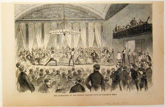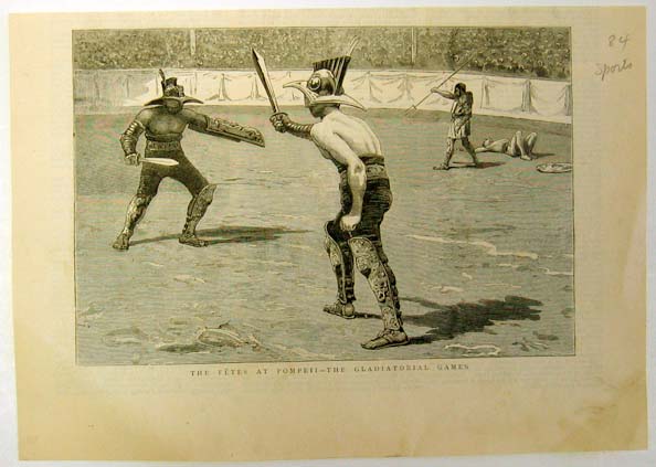 ![]() 019fen: 1828 Circus of Troop Pictures. Engraved images titled, "The Men and the Work of Troop, Ready for the Fray, In the Melee and The Melee," drawn by Frederic Remington from Harper's Weekly. Shows scene of men fencing on horses. 11 x 16in. $40 ![]() 020fen: 1884 Picture of men with their swords in the air. Engraved image from Harper's Weekly titled,"All their swords flashed, and every man cried, "God save King James!" Scene shows several men raising their swords in honor of King James. 11 x 16in. $30 ![]() 021fen: 1858 Picture of men in full duel dress and dueling. Engraved image from Harper's Weekly titled,"The Duelist in Full Dress and The Duel." Scene shows one duelist in full dress and the other shows several men dueling in full regalia. 11 x 16in. $30 ![]() 022fen: 1881 Picture of Military Athletics at Sandhurst College. Engraved image from The Graphic titled,"Military Athletics at Sandhurst College, The Trapeze, Descent of the Mast and Ropes, A Melee, Sword Exercise, The Horse and Sword and Bayonet." Scene shows several military men practicing different athletics exercises at Sandhurst College. 11 x 16in. $30 ![]() 023fen: 1859 Picture of the Exhibition of the Boston Fencing Club. Engraved image from Harper's Weekly titled, "The Exhibition of the Boston Fencing Club, at Papanti's Hall." Scene shows two fencers at the Exhibition of the Boston Fencing Club. 11 x 7in. $30 ![]() 024fen: 1849 Picture of men fencing. Engraved images from The Illustrated London News titled, "Assault of Arms at Willis's Room, Assault.-Broadsword vs. Bayonet and Mr. Bushman's Feat." Shows scenes of men fencing. 11 x 16in. $30 ![]() 025fen: Picture of men fencing and arguing. Engraved image from Harper's Weekly titled, "The Duel and Foul Play! He cried, Passionately. A Stroke Dessous!" Image drawn by R. Caton Woodville. Scene shows four fencing and arguing. 11 x 16 in. $30 ![]() 027fen: Picture of the Fetes at Pompeii-The Gladiatorial Games. Engraved image titled, " The Fetes at Pompeii-The Gladiatorial Games." Shows scene of two gladiators sparring in an arena. 8 x 11in. $30 ![]() 029fen: 1910 Chromolithograph showing a woman fencing which was featured on the cover of Harper's Weekly by Henry L. Parkhurst. It is in very good condition. 15-1/2 x 10-1/2 in. $60 |