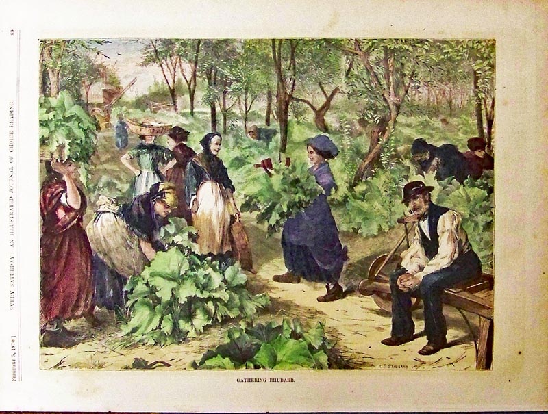 001bee: 1870 Gathering Rhubarb - Hand colored wood engraving featured in Every Saturday, An Illustrated Journal of Choice Reading. 14-1/2 x 11 in. $60
