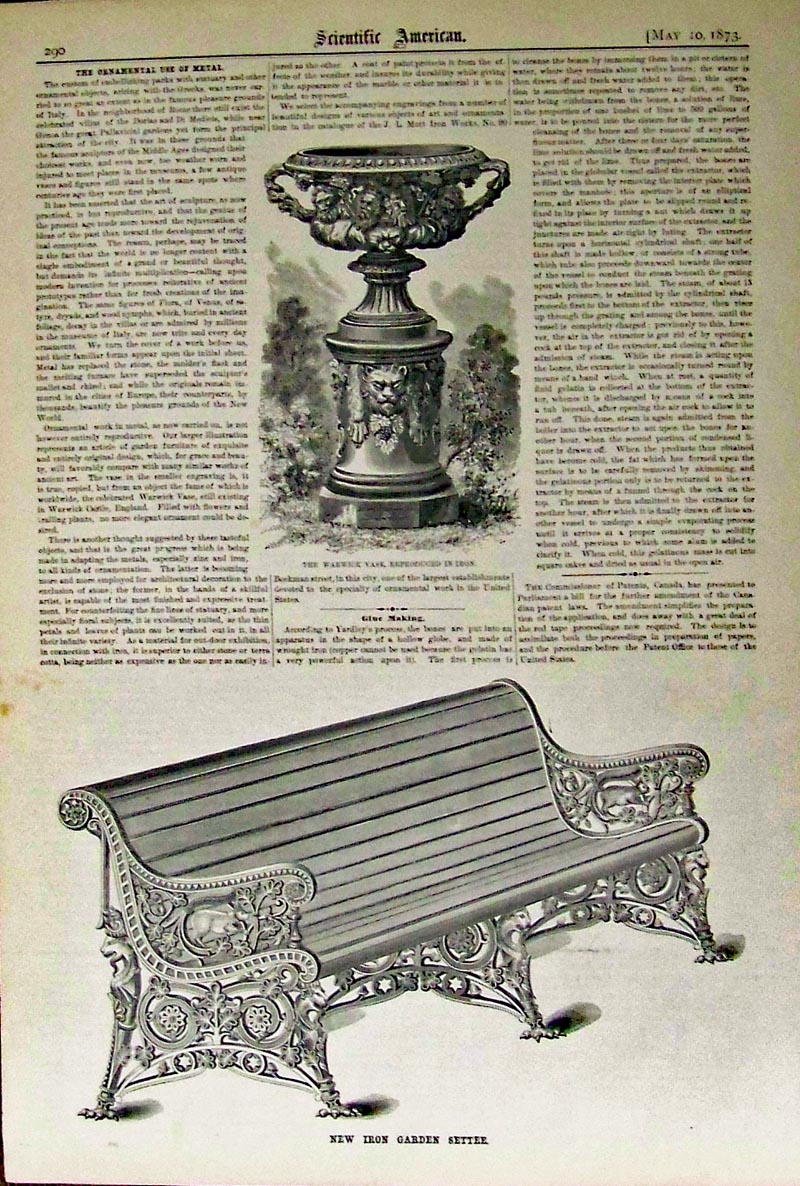 004bee: 1873 Scientific Journal wood engraving showing an iron bird bath in top image and the New Iron Garden Settee in lower image. Text surrounds images. 16 x 11 in. $30