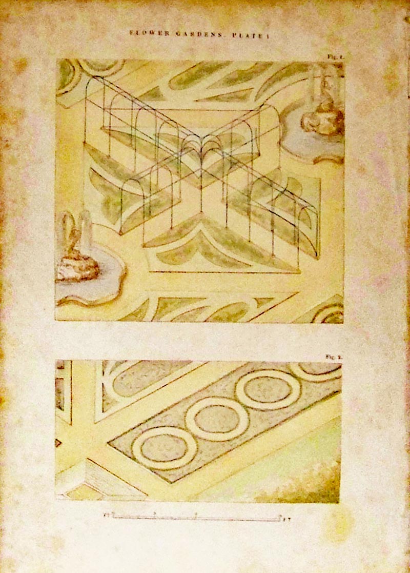 005bee: 1838 Flower Gardens - Hand colored lithographed Plate 1. Image shows a water fountain in top right corner and the layour for the propsed garden in both images. 9 x 6 in. $50 |