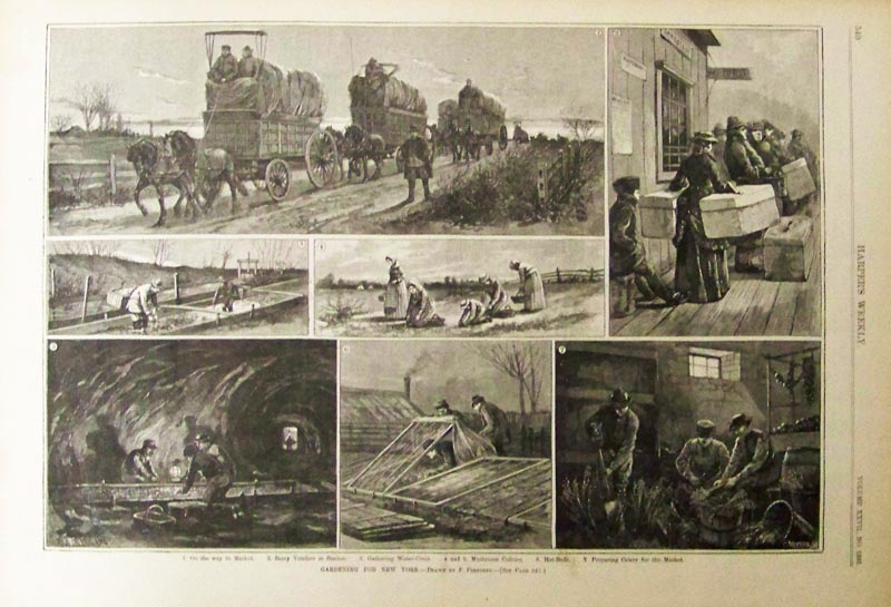 ![]() 006bee: 1889 Market Gardening, Uptown New York. Hand colored wood engraving featured in Harper's Weekly and drawn by W.A. Rogers. 15-1/2 x 11 in. $60 Black & White: $40 ![]() 007bee: 1883 Gardening for New York - Harper's Weekly wood engraved images showing the process of preparing produce for market. Drawn by P. Frenzeny. 16 x 11 in. $40