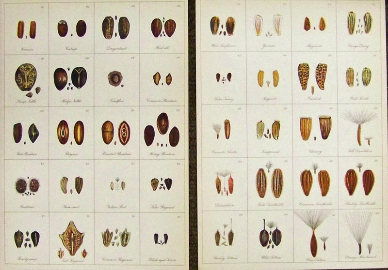 009bee: Set of two hand colored lithographs depicting assorted garden seeds and pods. Some shown are Dragonhead, Catnip, Dandelion, and Pale Plantain. Sold as a set, each page measures: 10 x 7 in. $90 Set