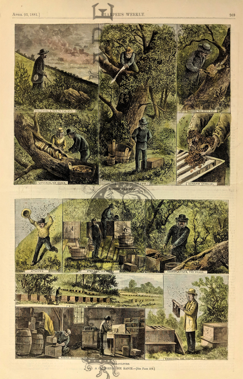 014bee: 1881 A California Bee Ranch. Harper's Weekly hand colored wood engravings showing the process of hunting for wild bees and how bees are then processed in the bee-culture. 16 x 11 in. $80 Black & White: $60