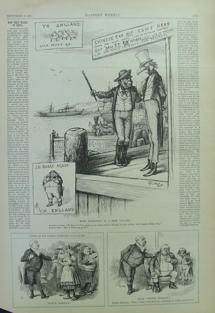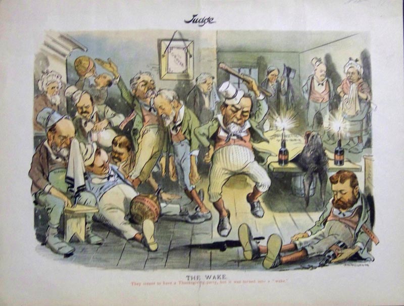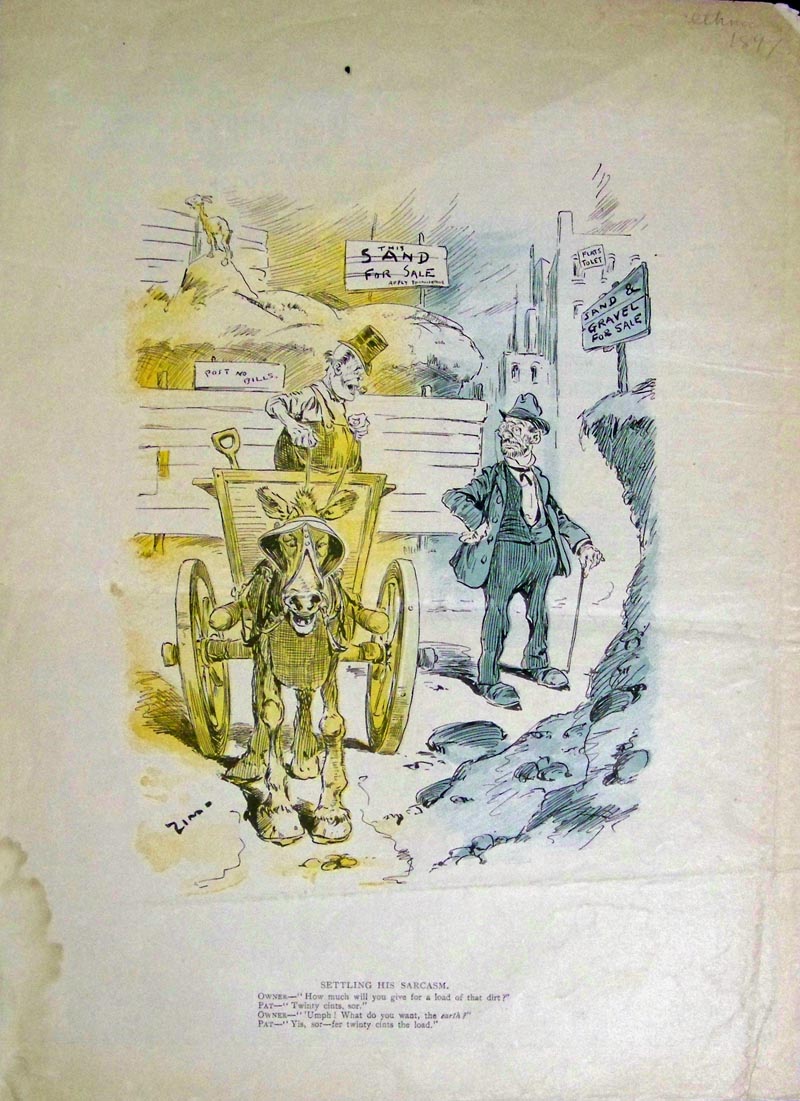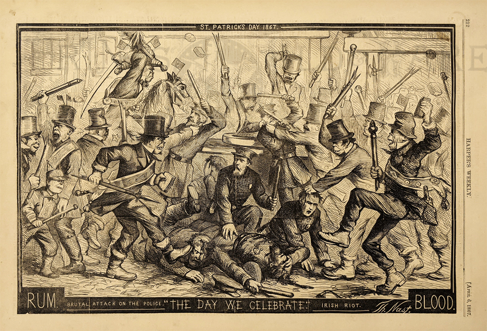 ![]() 028iam: 1878 Puck Magazine "The Difference Between Them - We have come to stay! We are going home!" Chromolithograph. 9 3/4 x 13 3/8 in. $60 ![]() 020iam: 1902 Chromolithograph featured in Puck titled, "Speculative." Scene shows Irish Schemers Maggie and Katie with Maggie telling Katie that her boyfriend is going to get an automobile by being struck by one and then suing for damage! 13-1/2 x 10 in. $100 ![]() 021iam: 1868 Cartoon published in Harper's Weekly by Thomas Worth showing two people comparing the price and virtue of coal to whiskey. Caption title reads, "A Mere Matter of Taste." 16 x 11 in. $30 ![]() 022iam: 1897 Chromolithograph showing the Irish as Smarties titled, "Settling His Sarcasm." Scene shows a conversation between Pat and Owner of sand he is selling. 14 x 10 in. $50 ![]() 023iam: 1894 Chromolithograph published in Judge titled, "The Wake" shows the Democratic Party having a wake over a dead donkey, with Cleveland's picture turned around to face the wall. 13-1/2 x 10 in. $90 ![]() 025iam: 1874 Hand colored wood engraving from The Illustrated London News is titled, "Meeting of The British Associaltion, Belfast." Scene shows six different monuments in Belfast. 15-1/2 x 10-1/2 in. $40 ![]() 026iam: C.1890 Chromolithograph showing derogatory cartoon vignettes titled, "St. Patrick's Day in the Morning" featured in Judge. 13 x 10 in. $40 ![]() 027iam: 1890 Chromolithograph featured in Puck by the artist, Opper showing scenes with Irish citizens and Uncle Sam being presented with a petition to relieve Ireland from the famine. 21 x 14 in. $100 ![]() 262nast: St. Patrick's Day 1867. "The Day We Celebrate" -Brutal attack on the police, Irish riot. 1867 Harper's Weekly. Wood engraving. Drawn by Thomas Nast. 11 x 16 in. $60 |