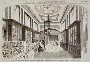 ![]() 002jwl: 1860 New York Jewelry Store Scene. Rare engraved image from the New York Illustrated News, titled "Our Broadway Palaces: Messrs. Orne & Co.'s Fashionable Jewelry Store, Under the Fifth Avenue Hotel." Nice view of the store's interior, showing wealthy people as they shop for jewelry. 8x11 in. $30