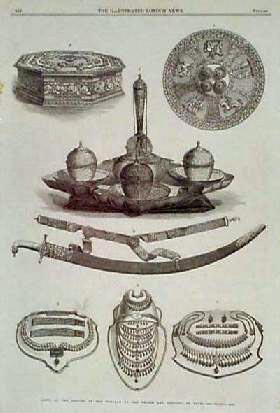 003jwl: 1865 Jewelry: India Gifts to British Royalty. Engraved images from the Illustrated London News, titled "Gifts of the Princes of the Punjaub to the Prince and Princess of Wales." Beautifully crafted silver items are shown, as well as jewel-encrusted necklaces and bracelets. There are several water stains along the left edge of this print, but the images are not affected. The stains could easily be covered by matting. 11x16 in. $40