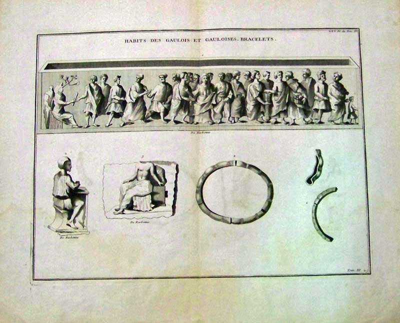 007jwl: 1880 Asian Jewelry Print. Color lithograph from an 1880 French book on jewelry design, showing numerous examples of Asian jewelry. 7x8 in. $50 ![]() 009jwl: C.1750 Copper engraving showing Roman bracelets titled, "Habits Des Gaulois Et Gauloises, Bracelets." 20-1/2 x 17 in. $50