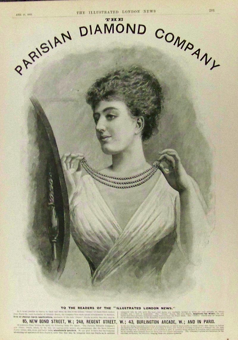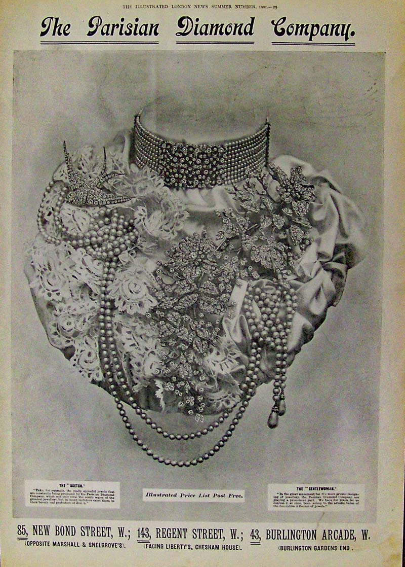 016jwl: 1901 Halftone advertisement featured in The Illustrated London News for The Parisian Diamond Company. Image shows a lacy covered bust adorned with lavish double-stranded pearls. 15-1/2 x 10-1/2 in. $50