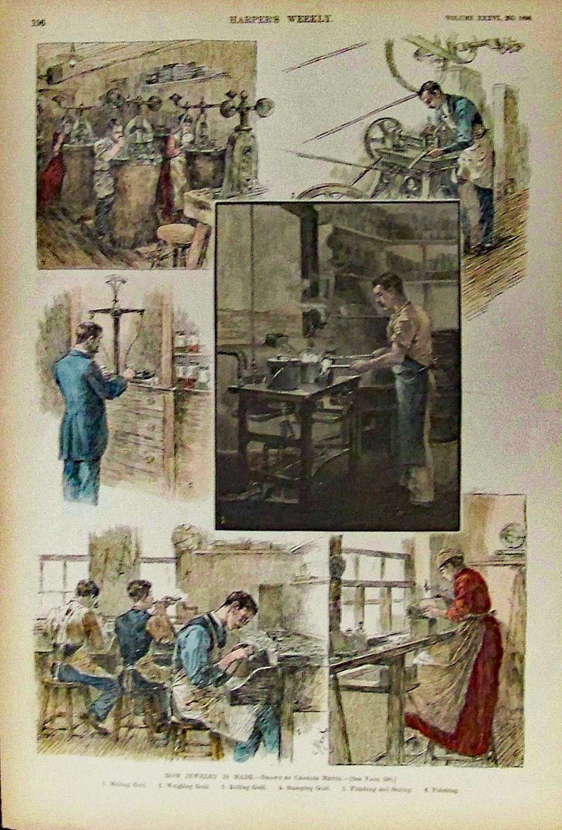 013jwl: 1892 Harper's Weekly hand colored wood engraving captioned, "How Jewelry is Made." Drawn by Charles Mente. Each image shows the steps in order of processing gold: 1. Melting Gold; 2. Weighing Gold; 3. Rolling Gold; 4. Stamping Gold; 5. Finishing and Setting; and 6. Polishing. 15-1/2 x 10-1/2 in. $60 Check for availability |