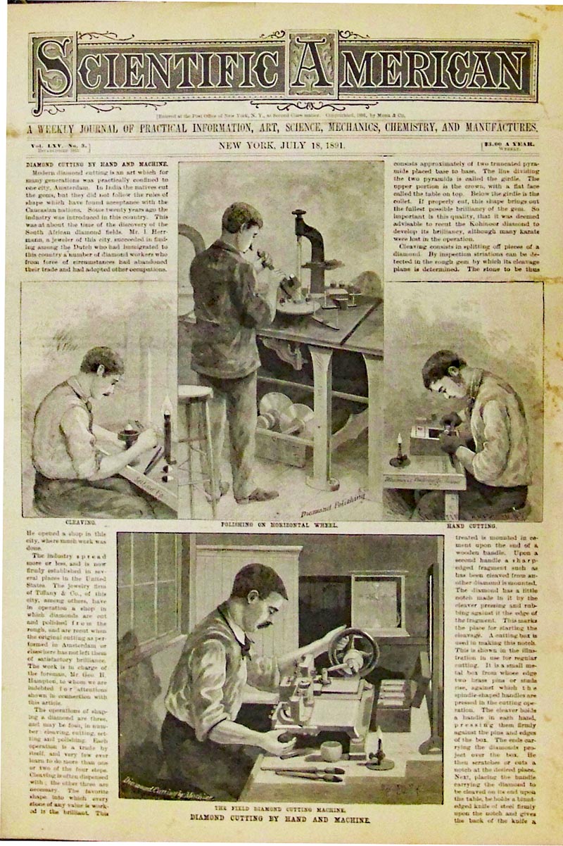 ![]() 014jwl: 1891 Scientific American wood engraving captioned, "Diamond Cutting By Hand and Machine." Images show cleaving, polishing, hand cutting and the Field machine diamond cutting. 15-1/2 x 10-1/2 in. $60