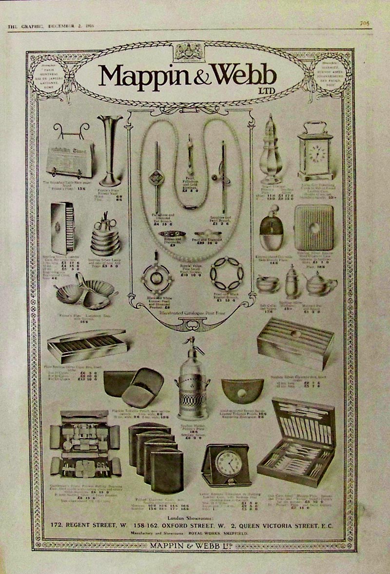 015jwl: 1916 Mappin & Webb Ltd. advertisement featured in The Graphic showing their jewelry and other fine products. 15 x 10-1/2 in. $50