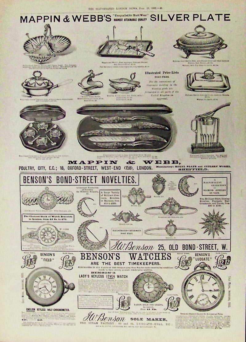 017jwl: 1889 The Illustrated London News advertisement for Mappin & Webb's Silver Plate items which include a richly fluted butter, bisquit and and cheese stand. 15-1/2 x 11 in. $50