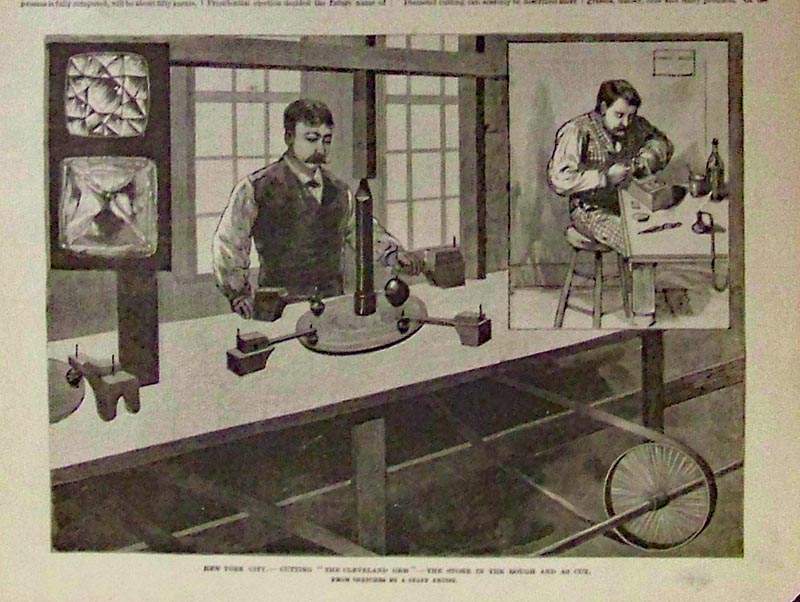 018jwl: 1884 Wood engraving featured in Frank Leslie's Illustrated Newspaper. Image caption reads, "New York City, -- Cutting the "Cleveland Gem" -- The Stone in the Rough and as Cut." 10-1/2 x 7-1/2 in. $40 |