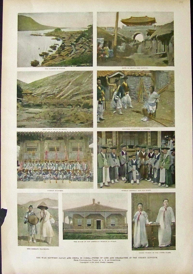 ![]() 003kor: 1894 Hand colored half-tone images showing nine vignettes around Fusan and Seoul titled, "The War Between Japan and China in Corea -- Types of Life and Character in the Hermit Kingdom." From Photographs Taken by A.B. De Guerville. One of the views shows Corean Soldiers and another shows the Gate of Seoul, The Capital. 16 x 11 in. $60