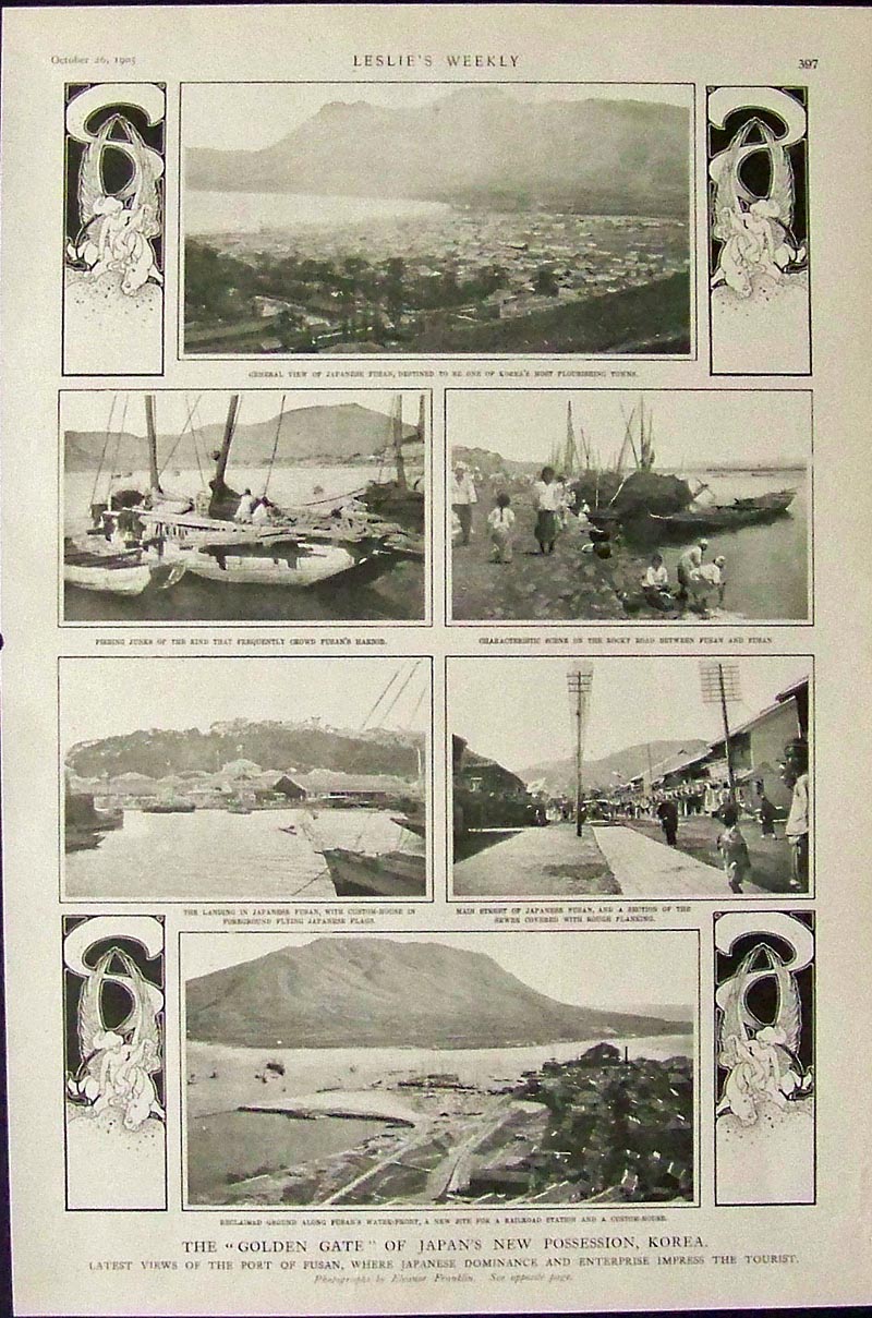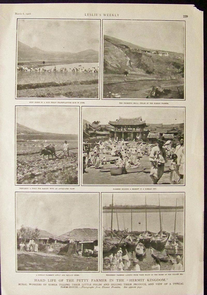 005kor: 1906 Half-tone images featured in Leslie's Weekly titled, "Hard Life of the Petty Farmer in the Hermit Kingdom." Images show Rural Workers of Korea Tilling their Little Fields and Selling their Produce, and a View of a Typical Farm-House. Photographs from Eleanor Franklin. 15-1/2 x 11 in. $50 006kor: 1905 Half tone images showing Fuson, The "Golden Gate" of Japan's New Possession, Korea. In fine condition. 10.5x16 in. $50 |