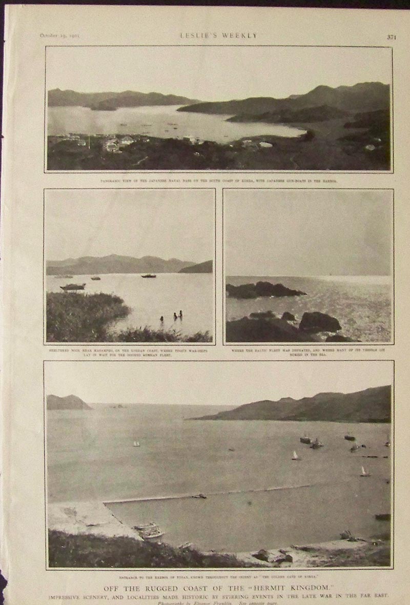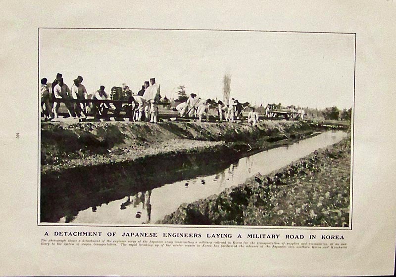 ![]() 007kor: 1905 Half-tone engraved images featured in Leslie's Weekly titled, "Off the Rugged Coast of the Hermit Kingdom." These four images show the Impressive Scenery, and Localities Made Historic by Stirring Events in the Late War in the Far East. Photographs by Eleanor Franklin. 15-1/2 x 11 in. $50 ![]() 008kor: 1904 Half-tone titled, "A Detachment of Japanese Engineers Laying A Military Road in Korea." This road had been used for the transportation of supplies and ammunition. 13-1/2 x 9-1/2 in. $30