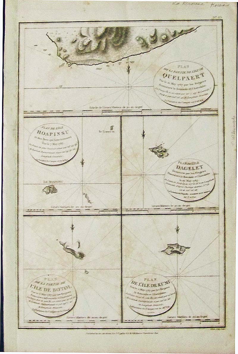 013kor: 1887 Hand colored wood engraving featured in The London Graphic showing 12 vignette views of today's Samson District -- Islands off the Southern Coast. Title of page is, "Port Hamilton As It Is." Images show Port Hamilton, Corea, Which Might become an important Naval Arsenal and Coaling Station for Russia and Was Taken Possession of by England in 1885 -- It has now been Handed Over to China. 16 x 11 in. $70 ![]() 015kor: 1798 Copper engraving from the Voyages of La Perouse showing the Islands off the Korean Coast. Published as the Act directs by G.G. & J. Robinson, Paternoster Row, London. 16-1/2 x 10-1/2 in. $295 |