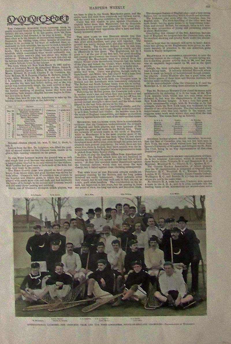 010lacr: 1897 Harper's Weekly half-tone image with article showing the International Lacrosse -- The Crescent Team and the West-Londoners, South-of- England Champions. 15-1/2 x 10-1/2 in. $40 |