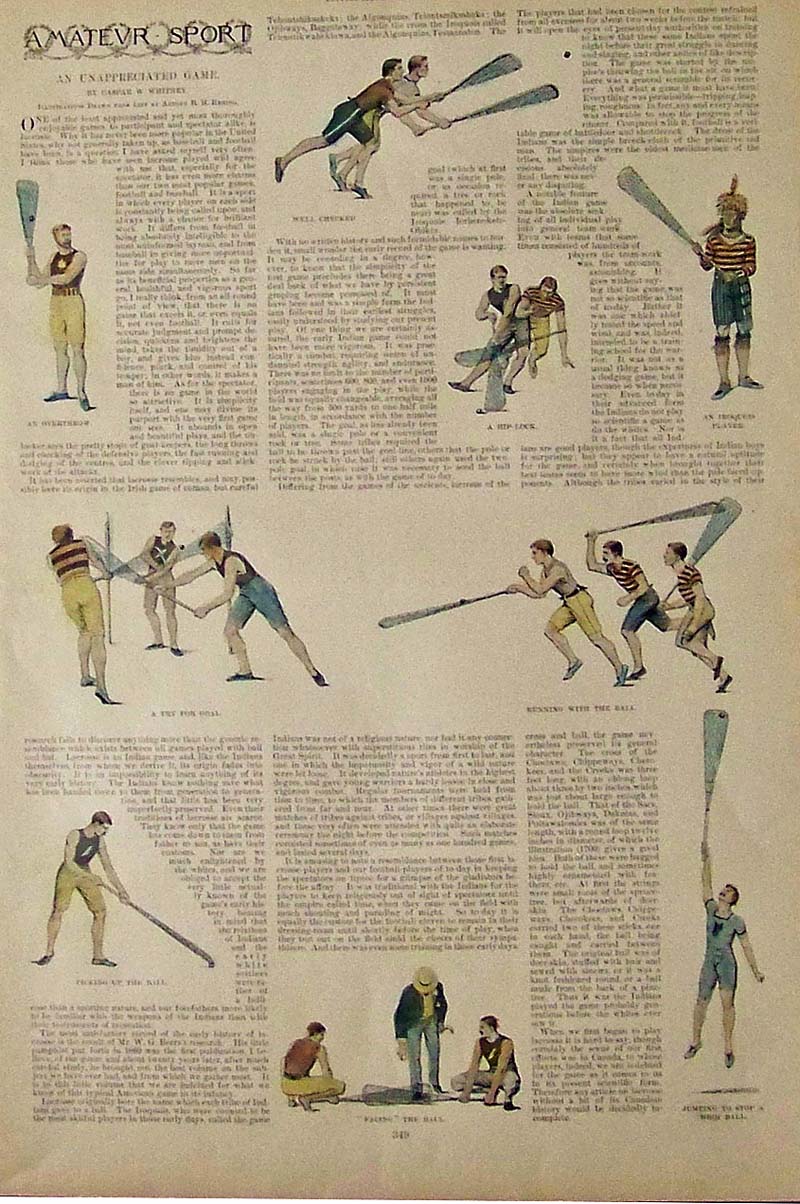 015lacr: 1894 Images of men playing the game of Lacrosse. Gorgeous hand colored engraved image titled,"Amateur Sport, An Unappreciated Game," from Harper's Weekly. Shows different scenes of men playing the game of Lacrosse. 11 x 16in. $60 SOLD
