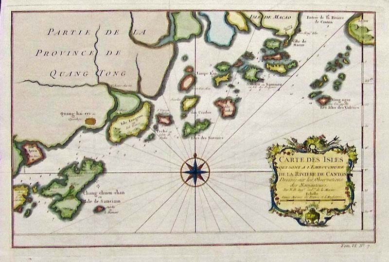 017macao: C.1750 Hand colored copper engraved map of Partie De La Province De Quang Tong which shows the bottom of Isle de Macao and the Entrance to Canton River. 13-1/2 x 9-1/2 in. $300