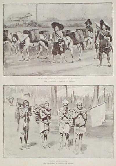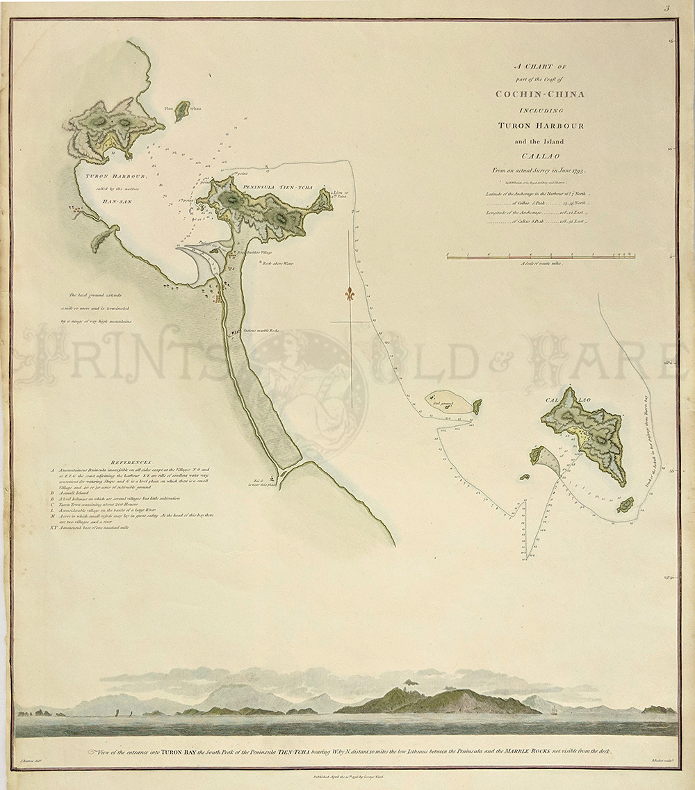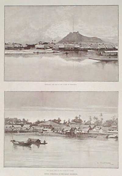 ![]() 011indo: Rare Vietnam and Pirates: Regio Gannam or Kingdom of Tonqueen, 1730 - A rare engraved hand colored map of the Hainan, the Northern part of Vietnam and southernmost China. The map is oriented with West at the top and provides an interesting presentation of Northern Vietnam with a reference to Laos over the mountains to the west. In the city of Cancry, six of the villages are noted to be inhabited by Pirates of the long-haired Chinales who were expelled in 1682. A large compass in the middle radiates lines out from the center to the right of the Island of Aynam. Condition: Very good, some browning on edges, overall good color, size 10 x 7 image. $500 ![]() 133rare: 1796. A Chart of Cochin, China Including Touron Harbour and the Island of Callon, . H. W. Parish & J. Barrow. showing the coast of Vietnam and today's Danang with inset showing the land profile. Steel plate hand colored engraving from Staunton's survey June 1793. Left border has been patched 3" at bottom. Excellent condition. 17 x 22" plus margins. $375 ![]() 001indo: 1890 Malaysia Scenes. Two antique engraved views from the Illustrated London News. Top view is titled "Tringganu, the Seat of the Sultan of Tringganu." Bottom is titled "The Pekan, Seat of the Sultan of Pahang." 11x16 in. $30 ![]() ![]() ![]() 002indo: 1891 views in Burma. Two engraved scenes from the Illustrated London News. Top view is titled "The Manipur Expedition: Panthay Mules and Mule-Drivers." Bottom is titled "Burmese Letter-Carriers." 11x16 in. $30 ![]() 003indo: 1890 People, Scenery in Siam. Six engravings from the Illustrated London News, titled "Sketches with the Anglo-Siam Boundary Commission." Shows natives of Siam, and views of the Siamese countryside. 11x16 in. SOLD |
