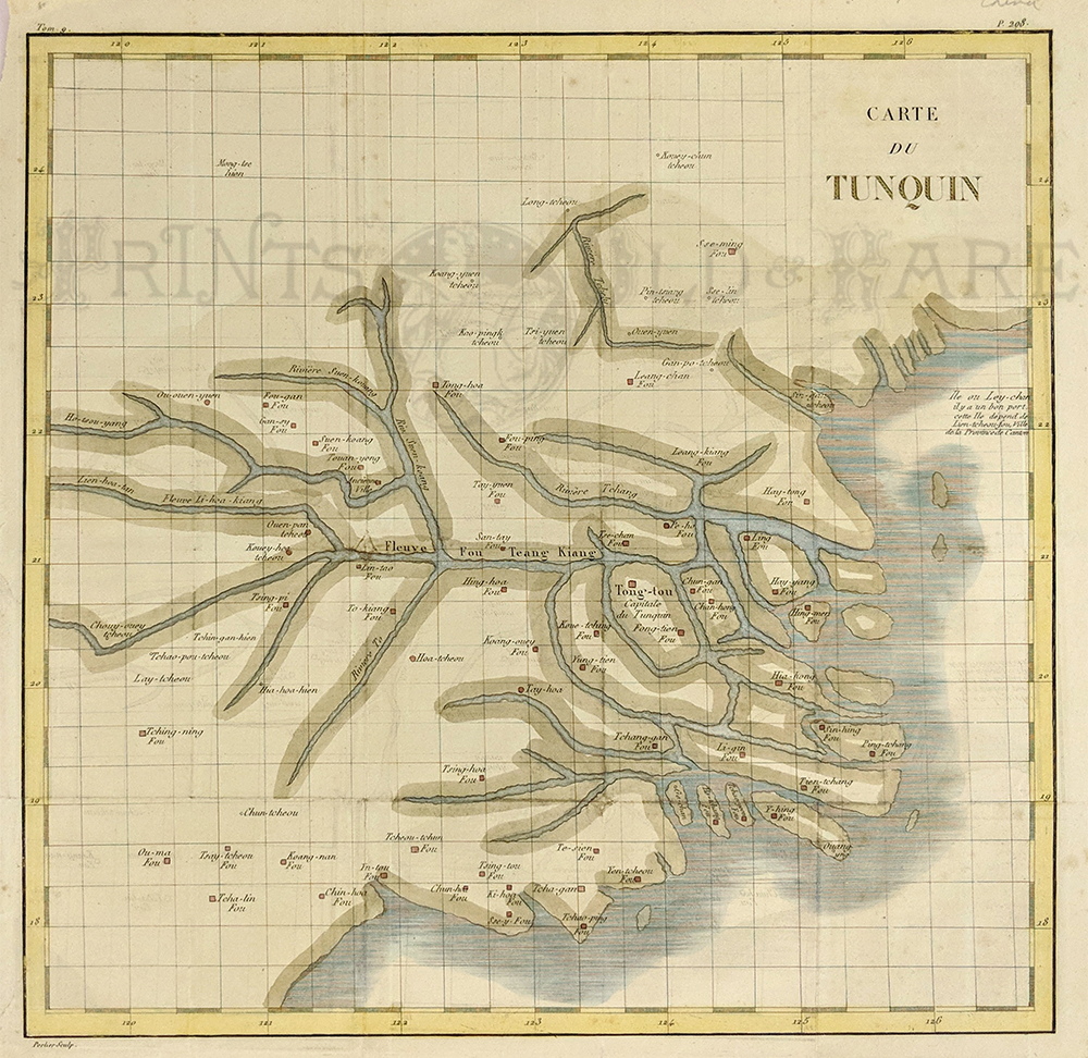 ![]() 136rare: NORTH VIETNAM. c.1780 Engraved by Canu, Map of Tunquin, Where the Vietnam War started. Shows the many rivers around the capital Hanoi, in North Vietnam, compiled by several reports of early French Jesuit explorers. Watercolor copperplate engraving on handmade paper. Very good condition. Measuring 14 x 14" plus margins. $450 ![]() 012indo: Cartes des Cofes de Cochinchine Tunquin, Bellin 1769 - A wonderful small engraved and hand colored fine detailed mid-18th century antique map showing the Gulf of Tonkin with today’s Vietnam, Southern China and Island Hainan, Cartographer, J. N. Bellin, published in Antonine de Prevost d’ Exile’s Histoire generale des Voyages. Condition: Very good, small left margin with some browning on the edges. size 5.5 x 8 image $250 ![]() 004indo: 1884 Rice Mill in Tonquin, SE Asia. Engraved view of villagers in Tonquin, Indochina, milling rice with a foot-operated machine. From the New York Daily Graphic. 6x10 in. $20 ![]() 005indo: 1875 Burma Soldiers Guarding Buffalo Bones. Rare engraving from the Illustrated London News, titled "Burmese Soldiers Guarding the Bones of Sacrificial Buffaloes." Accompanied by an article about Burmese customs, and a smaller engraving of the Burmese Prince's chief wives. 11x16 in. $30 ![]() 006indo: 1888: Native Boats on Gulf of Tonkin. Beautiful lithographed scene, printed in 1888 by a French publisher. Title is "Caboteurs du Golfe du Tunquin, entrant a Tourane." Shows three native boats sailing through the water, with land in the distance. 14x21 in. $100 ![]() 008indo: 1891 Hand colored wood engraving featured in The Illustrated News of the World. Tile of image is, "A Siamese Royal Family Festival: The King Presenting the Crown Prince To the People." 16 x 11 in. $50 |