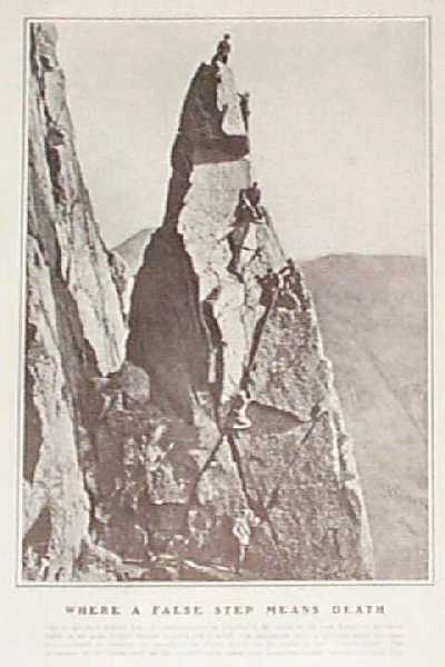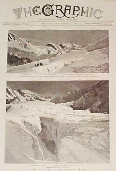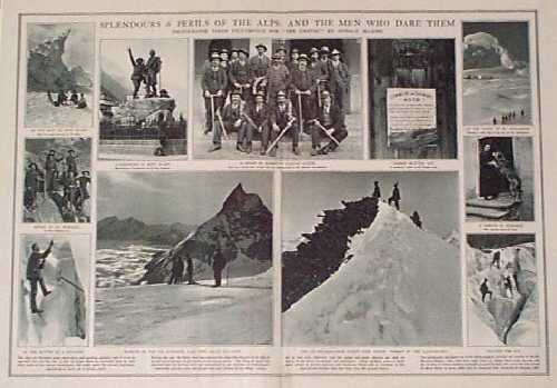 ![]() 009moun: 1902 Swiss Alps Mountain Climbing Scene. Photographic scene from Harper's Weekly, showing a group of climbers ascending the Jungfrau in the Swiss Alps. 9x13 in. $30 ![]() 010moun: 1891 Scenes: Accident on Mont Blanc. Engraved images from The Graphic, showing a large crevasse on Mont Blanc where several climbers fell during an avalanche. 11x16 in. $30 |