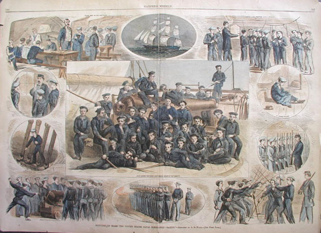 ![]() 106nav: 1881 Navy Torpedo School, Newport RI. Hand colored engraving from Frank Leslie's Illustrated Newspaper, titled "Rhode Island: Experiments with Improved Apparatus at the United States Torpedo School, Newport. Contains views of various types of torpedoes, and scenes of those torpedoes being tested. 11x16 in. $50 ![]() 107nav: Revolutionary War Navy Uniforms. Color lithographed print, showing uniforms worn by US Navy fleet commanders in 1776. Drawn by Werner, and published in 1899 as an illustration to a book. 13x16 in. $100 ![]() 108nav: 1865 Naval Cadets (Pensacola) from the August 19, 1865 issue of Harper's Weekly. Cadets pictured in several hand colored, wood engravings on their training ship "Sabine" at the very time the Civil War was ending. Images from sketches by A.B. Waud. Center crease has been archivally repaired. 16x22 in. $200 ![]() 200nav: 1887 Navy Sailors Scene by Frederick Remington. Uncolored engraving from the Feb. 10, 1887 issue of Harper's Weekly, titled "Sketches on a Man-of War Under Sailing Orders: The Last on Board." Drawn by 19th century artist Frederick Remington. 11x16 in. $80 ![]() 1175nav: 1896 book: The Navy and Army Illustrated. "A Magazine Descriptive and Illustrative of Everyday Life in the Defensive Services of the British Empire." Handsomely bound copy of Navy & Army Illustrated, December 20, 1895 - June 12, 1896 (Volume One). 316 pages, heavily illustrated. $95 |