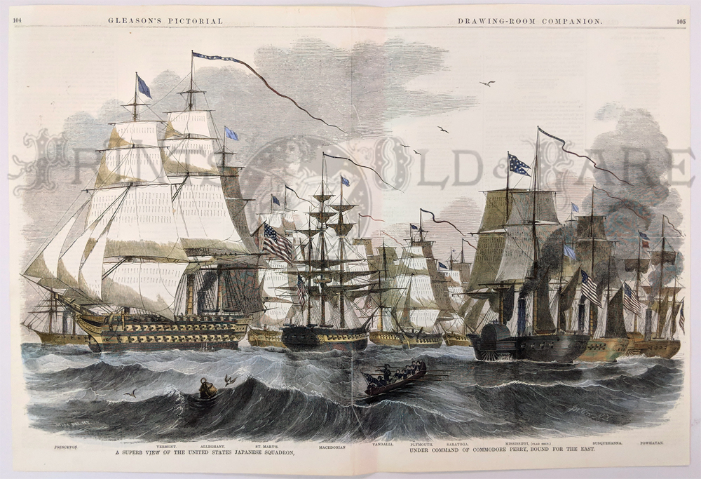 ![]() 206army: Army Navy Journal 75th Anniversary issue. Large format softcover published 1938. 138pp. Great ads, articles by FDR, Admiral Leahy, and General Pershing (includes his full color portrait.) 11 x 14 in. $40 ![]() 203nav: 1899 Grand Naval Parade, New York Harbor for Admiral Dewey from the Statue of Liberty facing Manhattan and Brooklyn. Shown are also Governor's Island and Brooklyn Bridge in the distance. Hand tinted half-tone engraving, folded in middle. 42 x 15 in. $250 ![]() 204nav: 1853 Hand colored wood engraving showing Commodore Perry bound for Japan. Superb views of Perry's fleet opening Japan to trade.Featured in the Drawing-Room Companion. 22 x 15 in. $350 ![]() 205nav: 1851 U.S. Frigate hand colored wood engraving showing the U.S. Frigate at the Commencement of the Action with the British Frigate Guerriere, August 19, 1812. From Ballou's Pictorial Drawing-Room Companion. 22 x 15 in. $250 ![]() 206nav: 1744 Sir Francis Drake - This is a very old, spectacular hand colored copper engraving showing an ornate portrait of Sir Francis Drake as a young man and a battle scene below. 16 x 10 in. $150 ![]() 1009nav: 1887: Gardiner's Bay Target Practice. Original Harper's Weekly (1887) Target Practice at Gardiner's Bay by the Men-Of-War. Color: Black and White. Type: Wood Engraving. Size: 11x16 in. $30 |