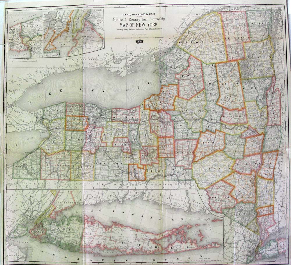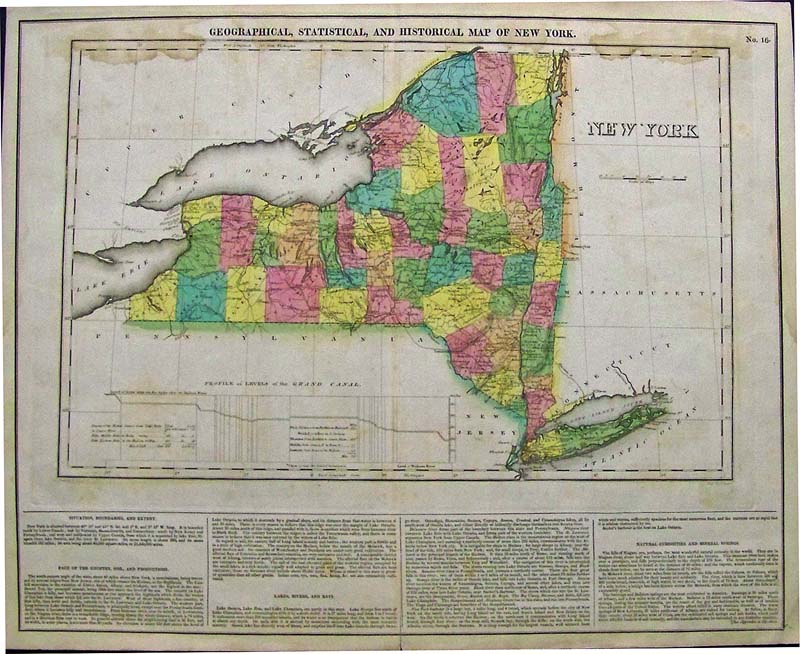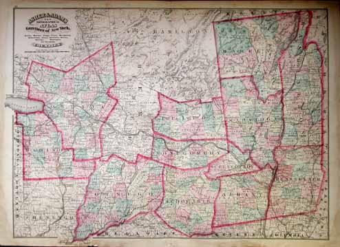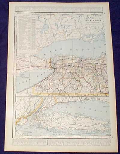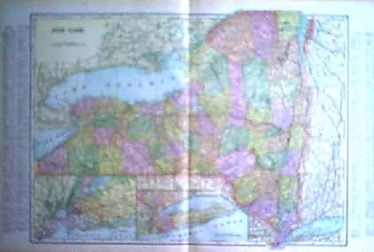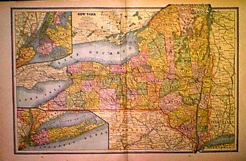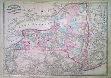 SEE: ![]() Click here to view Great Lakes Charts ![]() 000NewYork: Rare Railroad map of New York State, 1857. Map shows cities, counties, and has a hand drawn relief for lakes and terrains. Map also shows railroads in operation, in progress and railroads proposed. Map is hand colored and engraved. The top margin is reinforced. 29 x 29 in. $695 ![]() 001ny: Colton’s New York, 1882 - A large original color engraved and very detailed map of the state of New York, with seven insets: Oswego, Buffalo, Rochester, Syracuse, Albany, Troy and New York City. The main map in center has typical pastel coloring of counties and insets are large but not colored. This is a rare and hard to find map with the very decorative spiral motif border in excellent condition, plate numbers 32 and 33 from one of Colton’s School atlases. Condition: Excellent small margins, one fold through center. 25 x 17 image $295 ![]() 002ny: 1873 Gray's New York Map. Spectacular state map, shows part of New England. Original color. 28x17-1/2 in. $120 ![]() 003NewYork: Plans of Westchester, West Farms, Morrisania, Westchester Co and Parts of New York County, Beers 1867 - An unusual and handsome original colored map of this area that is now part of the Bronx, (Morrisania.) Included are the towns of Belmont, Bronxdale, Fordham, Kingsbridge and Schulylerville. Fort Schulyer is located at the tip of Throggs Neck. This map is plate no 4, from "Atlas of New York and Vicinity" by F. W. Beers, Ellis and Soule, NY. Early roads, outlines of homes, property lines and owners’ names are shown, along with the railroad lines and other major roads. Condition: Very good, nice margins, light age toning on edges. size 13 x 16.75 image. $200 SOLD ![]() 004ny: 1838 Bartlett Brooklyn view. Hand colored steel engraving, view from Gowanus Heights, Brooklyn. 10-1/2x8 in. $50 ![]() 005ny: 1885 Statue of Liberty construction. Inset of Bartholdi. NY Harbor and Brooklyn Bridge in background. Black & white engraving from Harper's. 16x11-1/2 in. $30 ![]() 006ny: 1870 New York Geological Map. Asher & Adams map by C.H Hitchcock of Dartmouth. Hand colored map showing different soils throughout the state. 24x17-1/2 in. $80 ![]() 007ny: 1875 Brooklyn Revivalists. The Revivalists in Clermont Avenue. Hand colored antique engraving from Harper's. 15-1/2x11 in. $50 ![]() 008ny: 1838 Saratoga Springs. Bartlett hand colored engraving, "Colonnade of Congress-Hall." 8x11 in. $50 ![]() 010ny: 1873 Lake George. Hand colored steel engraving from Picturesqe America. 12-1/2x9 in. $50 ![]() 011ny: 1838 Erie Canal Bartlett view. Hand colored steel engraving of canal boat at Little Falls. 11x8-1/2 in. $60 ![]() 013ny: 1838 New York City. View from Weehawken by Bartlett. Attractive hand colored steel engraving. 11x8-1/2 in. $60 ![]() 015ny: 1873 East Hampton. Hand colored engraved view from the Church Belfrey. 9-1/2x12-1/2 in. $40 ![]() 016ny: 1873 New York City view. View from Brooklyn Heights. Bay and much river traffic with Brooklyn Bridge in background. Striking hand colored engraving. 10-1/2 x 8 in. $80 ![]() 017ny: 1901 Map of New York State. Fine old color map of New York, with counties differentiated by color. Shows railroads and rivers, with a key to county and city locations. 22x15 in. $40 ![]() 019ny: 1901 New York Summer Life. "Floating Roof Garden." Hand colored scene of New Yorkers watching a minstrel show. 16x11 in. $50 ![]() 021ny: 1838 Bartlett view - Sing Sing. On the Hudson at Tappan Sea. Hand colored steel engraving. 11x8 in. $60 ![]() 022ny: 1873 East Hampton, Long Island. Windmills view. Hand colored engraving. 9-1/2x11 in. $40 ![]() 023ny: Beautifully hand colored steel engraving. Published by Herrmann J Meyer in Meyer's Universum c 1850. Picture titled, Passaie Falls. 7.5x10 in. $75 ![]() 026ny: 1873 Adirondack Woods. Hand colored steel engraving from Picturesque America. 12x9-1/2 in. $50 ![]() 029ny: 1873 Buffalo. Main Street, view from St. Paul's Church. Hand colored engraving. 9-1/2x12 in. $40 ![]() 032ny: 1858 Troy, Mount Ida. View looking toward Hudson River. Hand colored steel engraving. 11x8-1/2 in. $50 ![]() 033ny: 1892 New York State Map. Printed in litho color. Insets of Long Island and NYC area. 21-1/2x14 in. $40 ![]() 034ny: 1873 Central Park. View of The Terrace. Pretty hand colored view of families enjoying the park. Steel engraving from Picturesque America. 11x8-1/2 in. $50 ![]() 035ny: 1873 Catskills. Attractive hand colored steel engraving. "Sunrise from South Mountain." 9x12-1/2 in. $40 ![]() 036NewYork: 1858 Colton's Map of New York State - Antique hand colored map by Colton, one of the premier map makers of the 1800s, excelent original color and beautiful margin, townships delineated by color. With seven black and white insets of city plans for Albany, Troy, New York City, Syracuse, Rochester, Buffalo, and Oswego. Condition is very good, paper is toned overall, slight browning and yellowing on edges and folded in the middle. size: 17 x 25 inches. $250 ![]() 037ny: Malden - Ulster City -- North River BlueStone Works. 1875 Hand colored lithograph showing river boats with buildings, including a saw mill in the background. 27-1/2 x 16 in. $395 ![]() 038ny: 1871 New York Railroad Map. Asher & Adams orginal color. Good detail. 24-1/2x18 in. $120 ![]() 040ny: 1872 New York County Map. Original color from Asher & Adams. Shows Oneida Lake in the west. Albany to Lake George in the east. 24-1/2x18 in. $100 ![]() 043ny: 1884 Mitchell, New York State Map. Original hand colored, with five insets of New York City, Buffalo, Rochester, Albany and Troy. 23x15-1/2 in. $90 ![]() 044ny: OLD MAP - NEW YORK STATE. This hand colored engraving was done in 1855 by Colton. Shows the counties of New York State, cities, railroads, even the Erie Canal. The map is enclosed with an intricate Greek Key border. There are inserts of Niagara Falls and vicinity of New York City. 13 x 16 in. $120 ![]() 045ny: 1940 Northeastern New York maps. Two maps, first from Chautau