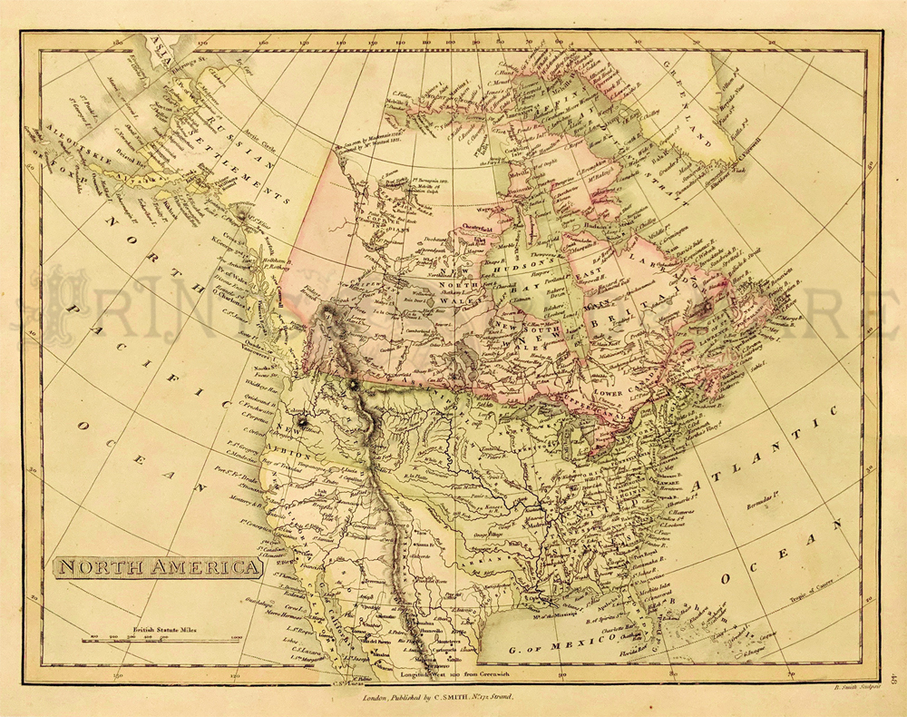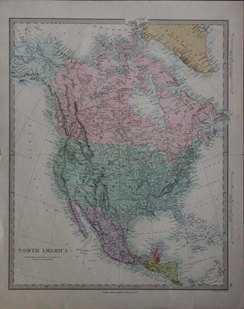 ![]() Also see our United States page ![]() 232nam: 1861 Johnson's Map of North America. Showing a number of important routes, the Pony Express and U.S. Mail Route. Also shows numerous American Indian tribes. Hand colored, lithograph. 18 x 27 in. $200 ![]() 233nam: Gall & Inglis' Map of North America. c.1880's. Texas, Upper California and Oregon Territory are shown in the West, along with a massive Missouri Territory. Canadian Transmississippi West is also shown along with the missions in California. In Oregon, the British Claims extend to the Columbia River, encroaching on the American claims to Puget Sound. Alaska is Russian Territory. Hand colored, lithograph. 21 x 25 1/2 in. $200 ![]() 234nam: 1856 Charles Desilver's Map of North America. Detailed map showing North America, Central America, the West Indies, Mexico, the United States, Canada, and Russian Alaska. Nebraska Territory encompasses most of the Northern part of the United States. Major cities, river systems, and other features are depicted in significant detail, along with International borders. Published in the final edition of "Mitchell's New Universal Atlas," S. Augustus Mitchell had sold the atlas publishing rights to Thomas Cowperthwait who then sold them to Charles DeSilver in the mid 1850s. 13 3/4 x 17 3/8 in. $175 ![]() 235nam: 1851 North America Map by Tallis. Decorative border featuring 10 vignettes of local scenes. Details of the map include rivers, topography, coastline, towns and political divisions. *Map does not show the American acquisition of the state of upper California from Mexico as a result of the Mexican-American War. 10 1/4 x 13 1/2 in. $200 ![]() 236nam: c.1808-45 Map of North America published by C. Smith from the New General Atlas. Hand colored, copperplate engraving showing the regions of North America, with Russian Territory, British Territory, United States Territory, and Mexican State. (Russian Territory is still shown at top left, and New California is still shown as part of Mexico.) 11 5/8 x 15 1/2 in. $200 ![]() 237nam: 1843 Tanner Map of North America. Showing rivers, mountains, towns, cities and topographical features. Political borders are in transition as the north is "Russian America" and Texas is shown as an independent republic. Hand colored copper engraving. *Light soiling right side. 11 5/8 x 15 1/2 in. $600 ![]() 239nam: America North & South with the West Indies 1794 by Samuel Dunn – published by Laurie & Whittle. Uses info and details from Captain Cook. 18 x 23 in. $395 ![]() 240nam: North American Map 1819 by John Thomson & Edinburgh. Important engraved map. Louisiana Purchase, also US still part of Mexico. Incredibly detailed. Inset: Ft. Niagara. 10 x 12 ¾ in. $275 ![]() 241nam: North America Map 1828 by John Melish. German version of 1822 Map. Engraving of US West to include all of Texas, Rocky Mountains, Columbia, and Columbia River. 16 1/8 x 20 ½ in. $1150 ![]() 242nam: 1852 North America Map published by Mitchell from his School and Family Geography edition. 11 x 9 in. $90 ![]() 243nam: 1821 Geographical, Historical, and Statistical Map of America. from the third Philadelphia Edition - Printed by T. H. Palmer for M. Carey & Son. Note that the west is named as Internal Provinces - New Navarre. Text gives detailed information of natural history, climate, population and poitical divisions. Routes of Columbus, Cortez and Pizarro are marked on the maps. 17.5 x 22in. $200 ![]() 244nam: America 1799. Cary Atlas. Menzies large handsome Western Hemisphere map by J&G Menzies. Map shows Sandwich Islands and Louisiana Territory. Mexico up thru California. And US as existed right after the Revolution. 21 3/8 x 27 7/8 in. $450 ![]() 245nam: 1838 Map of North America, Republic of Texas. Drawn by Sherman and Smith, published as an illustration to Olney's School Geography. Showing Mexico covering most of the US Southwest, US extends into what is now British Columbia. Texas extends over modern day Louisiana. Indian tribes are shown in Texas, as well as rivers and a few cities. **Small tears right margin. 9 5/8 x 12 1/8 in. $300 ![]() 246nam: 1762 L'Amérique divisée par grands etats by Janvier. features a huge, imaginary Sea of the West and hints of a possible Northwest Passage. Alaska is shown in an early configuration with a rough shape incorporating the Aleutians and notations concerning the coastline discoveries in 1741 by the Russians. In North America, the British colonies are shown east of the mountains, French Louisiana takes in most of the interior and Spain controls Florida, New Mexico and Mexico. There are several islands shown in the Pacific and just the western coastline of New Zealand. A handsome map with a decorative rococo-style title cartouche. 15 1/2 x 21 5/8 in. $625 ![]() 247nam: 1854 United States with Upper & Lower Canada. Published by G.F. Cruchley. Shown are cities, rivers, islands, bays, lakes, gulfs, mountains, etc. Upper Peninsula is part of Wisconsin. A number of Indian Tribes are shown. No West Viriginia shown. 14 x 18 1/2 in. $250 ![]() 229nam: 1920 Large North America Map. Colorful patriotic WWI era map bordered with timely photos. Shows flags of all nations and state statistics of area and population. 25 1/2 x 24 1/2 in. $75 ![]() 013frame: EXQUISITE PAIR - North America and British Dominions in North America by Fisher, 1823. US includes Louisiana Purchase but the rest of the west is still part of Mexico. Gorgeous gold leaf frames with beading and handmade French mats. Museum quality. Frame: 18 3/8 x 20 in. $650 ![]() 227nam: C.1850 North America New Six Penny Map by D. Macdonald, Glasgow. This is an original color engraved map. Note: Interesting feature: This map details after Texas became independent and before the California Revolution. Territory shown is the Oregon Border and Russian America, Texas in the U.S. and California and Southwest still in Mexico. 18-1/2 x 15 in. $325 ![]() 219nam: Amerique Du Nord 1870 Gujon - A large and very attractive engr