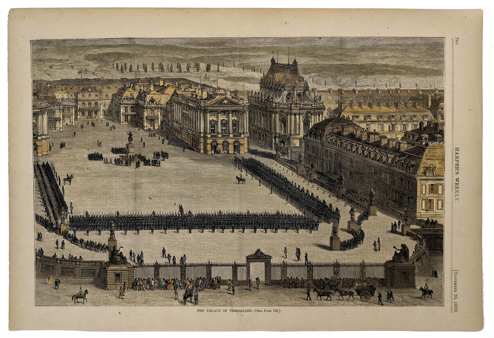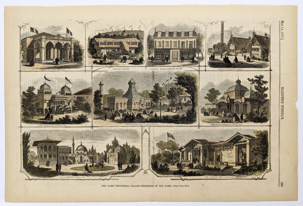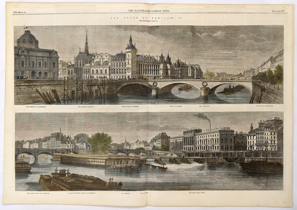 ![]() 218paris: The Paris Industrial Palace – Buildings in the Park. 1867 Harper’s Weekly. Showing 9 views of the various Pavilions and houses. Hand colored, wood engraving. 11 x 15 5/8 in. $80 ![]() 219paris: Birds-eye view of the Paris Exposition buildings and grounds - The Eiffel Tower, France. 1889 Frank Leslie’s. Hand colored, wood engraving. 6 x 10 ½ in. $40 ![]() 220paris: Her Majesty’s Visit to Paris – Note Dame, from the Seine. 1855 Illustrated London News. Hand colored, wood engraving. 10 7/8 x 15 ¾ in. $60 ![]() 221paris: The Palace of Versailles – 1870 Harper’s Weekly. Hand colored, wood engraving. 11 x 15 ¾ in. $60 ![]() 222paris: The Paris Exposition – Progress of the Buildings South bank of the Seine. From Quai Debilly. 1899 Harper’s Weekly. Hand colored, half-tone. 10 ½ x 15 ¾ in. $60 ![]() 223paris: Paris 1863. The Quays of Paris. Showing Tribunal of Commerce, Sainte Chapelle, Palace of Justice, Place Dauphine, etc. Published in the Illustrated London News. Hand colored, wood engraving. 15 ¾ x 21 ¾ in. $160 ![]() 225paris: Paris – Folding pocket map 1896. A 36-page promotional booklet for the Bon Marche department store in Paris, France. Used for reference in the creation of the Ashville, North Carolina, Done Marche department store, created and owned by the Lipinsky family. The elegant booklet contains a description of the Bon Marche administrative practice including personnel guidelines; a ribbon-map that can be used to estimate distance and to locate “instantly any street” and environ; and a comprehensive list of Paris, its streets, squares, etc. **Minor tears/rips on folds. Back booklet cover is loose. 21 5/8 x 27 in. $350 ![]() 226paris: 1882 Map of Paris from Encyclopaedia Britannica, Ninth Edition. Streets, landmarks, cemeteries, rail stations. places of interest, etc. Lithograph. 10 x 14 in. $30 |