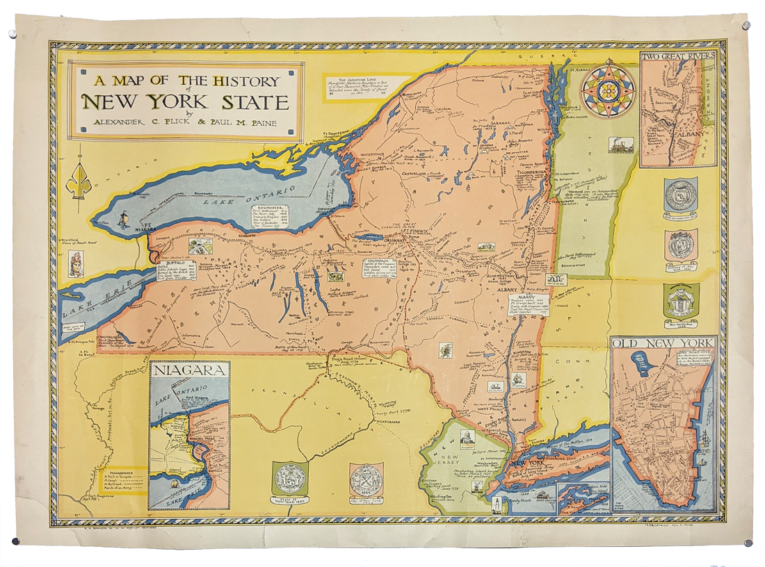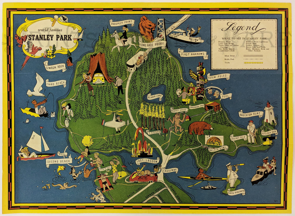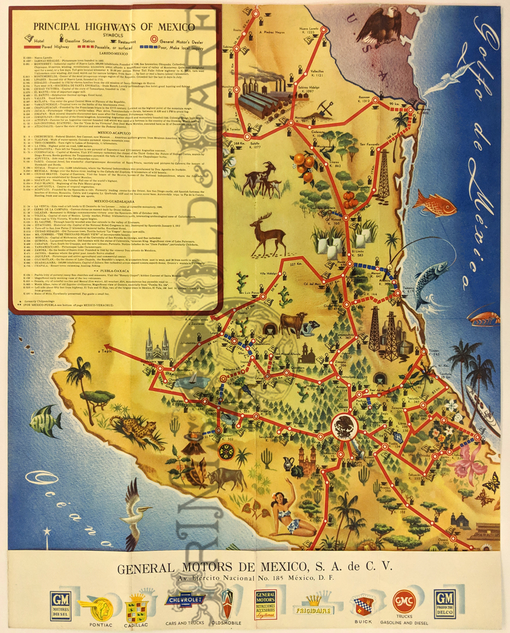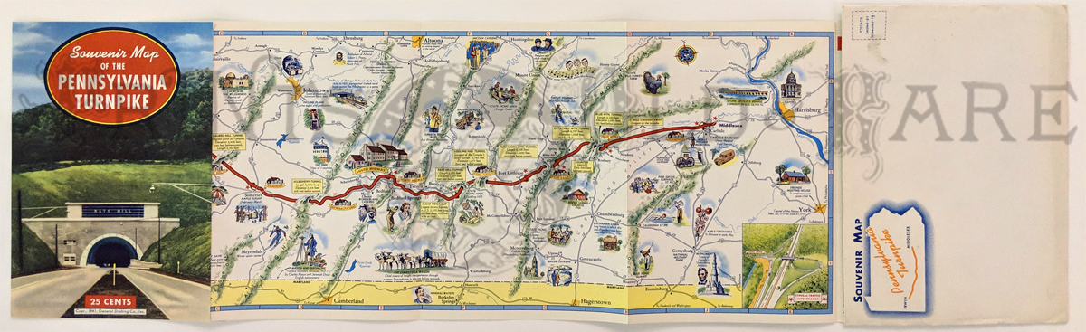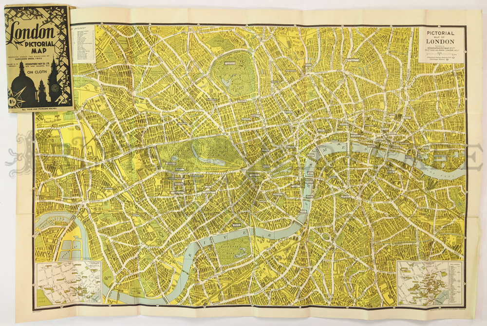 ![]() 005pictorialmaps: Picture Map of London – by Geographia 1929-30. Fabric backed. Printed in color. Highlights historical sites & buildings. Tear on side. 29 1/2 x 19 in. $185 ![]() 006pictorialmaps: Highway Map of Mexico – Pictorial map showing paved highways, passable and poor roads. Also, hotels, gas stations, restaurants and General Motors dealers. c.1950. Find condition. 17 x 23 in. $125 ![]() 007pictorialmaps: 1941 Pennsylvania Turnpike Map. Souvenir with pictorial map one side, facts and photos on verso. Fine condition – also comes with original envelope. Printed in color. 8 x 33 in. $40 ![]() 071can: c1940 Cartoon Pictorial Map of Stanley Park. Showing points of interest; Prospect Point, Lions Gate Bridge, Brockton Point Lighthouse, etc. Reverse describes Siwash Rock, Noted Monuments, The Zoo and Shakespeare Garden. 10 1/2 x 14 in. $90 ![]() 208cam: Guatemala Pictorial Map 1930s. Rare. Map by Delfino Sanchez Latour, Published by The National Tourist Committee. Mounted and framed. Bottom border shows people of Guatemala. Printed in color. 40 x 35 in. $350 ![]() 204swi: Geneva (Geneve) Pictorial Map by M. Bieder. 1970. Shows elevation of area around Lake Geneva, towns and roads. Colorful and interesting map. 16 3/8 x 26 5/8 in. $45 ![]() 314NewYork: History of New York State by Alexander Hulk and Paul M. Paine 1929 – Insets of Niagara and Old New York, Hudson and Mohawk Rivers. Printed in Color. 22 7/8 x 31 1/8 in. $150