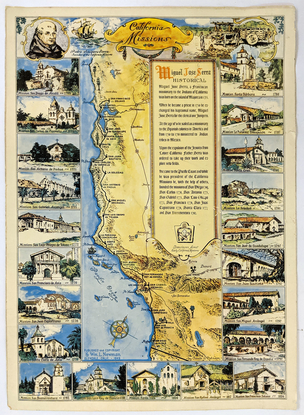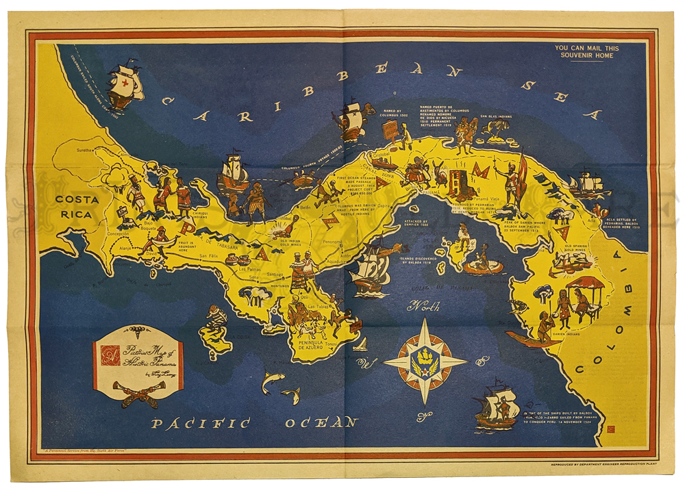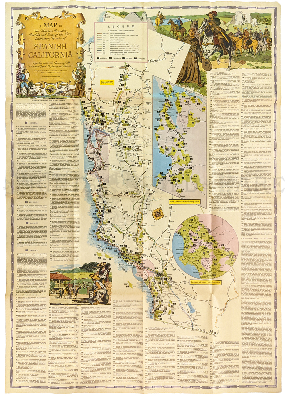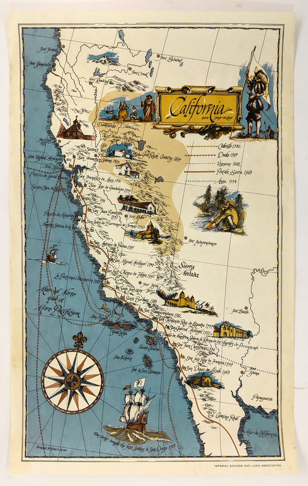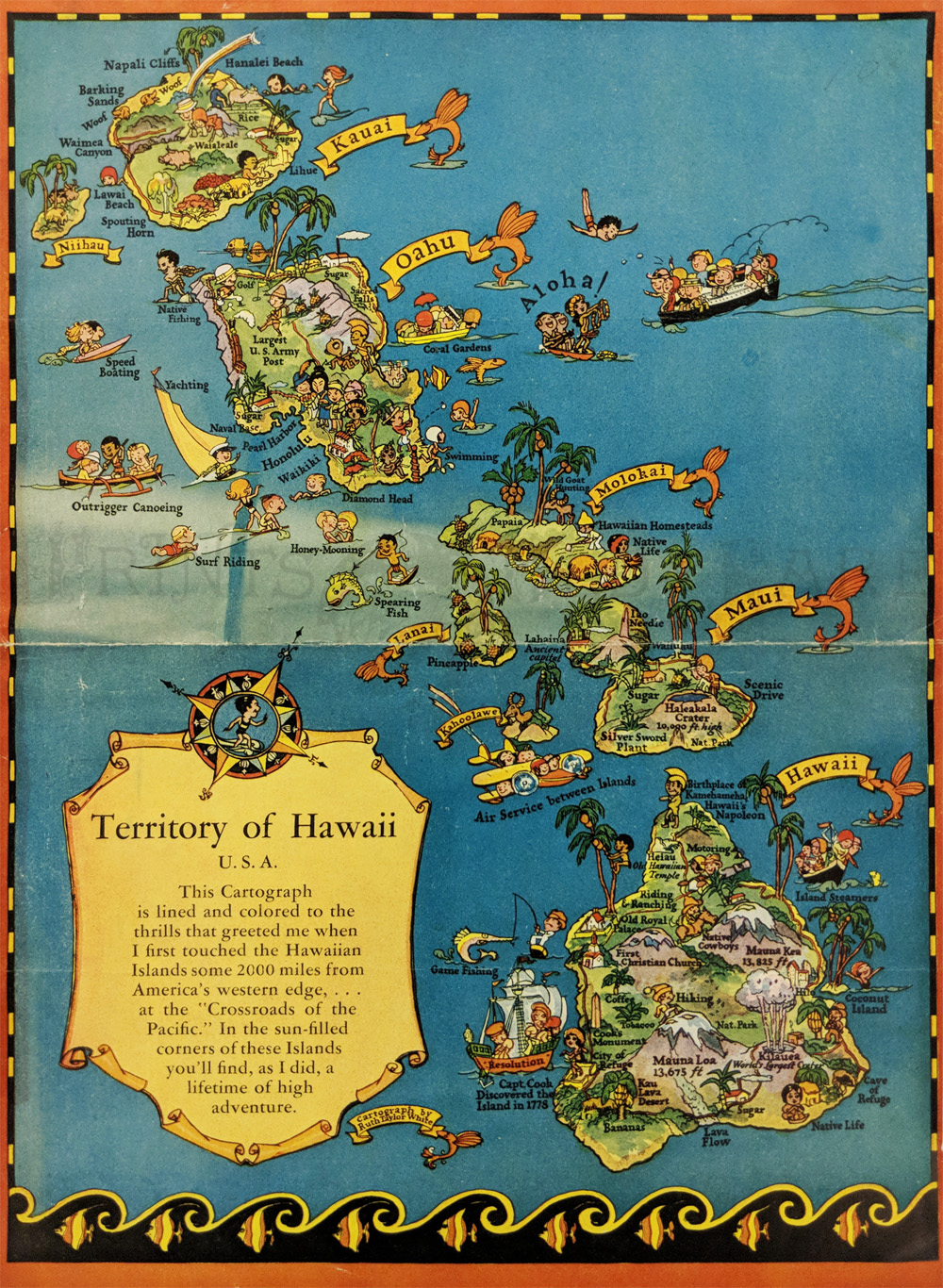 ![]() 009pictorialmaps: Historic Panama by Ting Leon. c.1914. Cartoon images of historical events and Indians. Distributed by Panama Mobile Force and Security Command. Verso: a brief history & map with description. 12 3/8 x 17 7/8 in. $125 ![]() 010pictorialmaps: Spanish California. 1956. A Map of the Missions, Pueblos, Ranchos and Routes of Exploration by Lowell Butler. For AAA, Published by Westways Magazine. 46 x 32 in. $65 ![]() 012pictorialmaps: Map of the US showing the dates of the first known printing in the several states 1940 by WPA by Douglas C. McMurtrie. Verso: American Imprints Inventory Publications. Pencil presentation: “Presented to Dr. Moon 1940.” 11 x 13 7/8 in. $150 ![]() 013pictorialmaps: California Missions Map 1949 Colorful original pictorial map by Wm. L. Newman. Shows locations, routes of the Franciscans, and pictures the missions. This vintage map is in fine condition. Size: 15 x 20 in. $325 ![]() 014pictorialmaps: California Pictorial Map c.1960 by George Otto Hanft. Attractive map – depicting locations and routes and important missions – with handsome compass rare gillions. Published defunct Imperial Savings and Loans. Size: 12 x 18 7/8 in. $250 ![]() 016pictorialmaps: Hawaii Map 1970s by Kim Forrest. Charming pictorial of the Hawaiian Island depicting locations and history. *Pinholes on corners where map was pinned up. Originally folded and now mended along center right fold. 23 x 17 1/4 in. $345 ![]() 018pictorialmaps: South America 1942. Pictorial Map by Ernest Dudley Chase. Published by Rand McNally, it features a decorative border, detailed cartouche and compass nose and points of interest. Fine condition. 20 x 27 in. $250 |