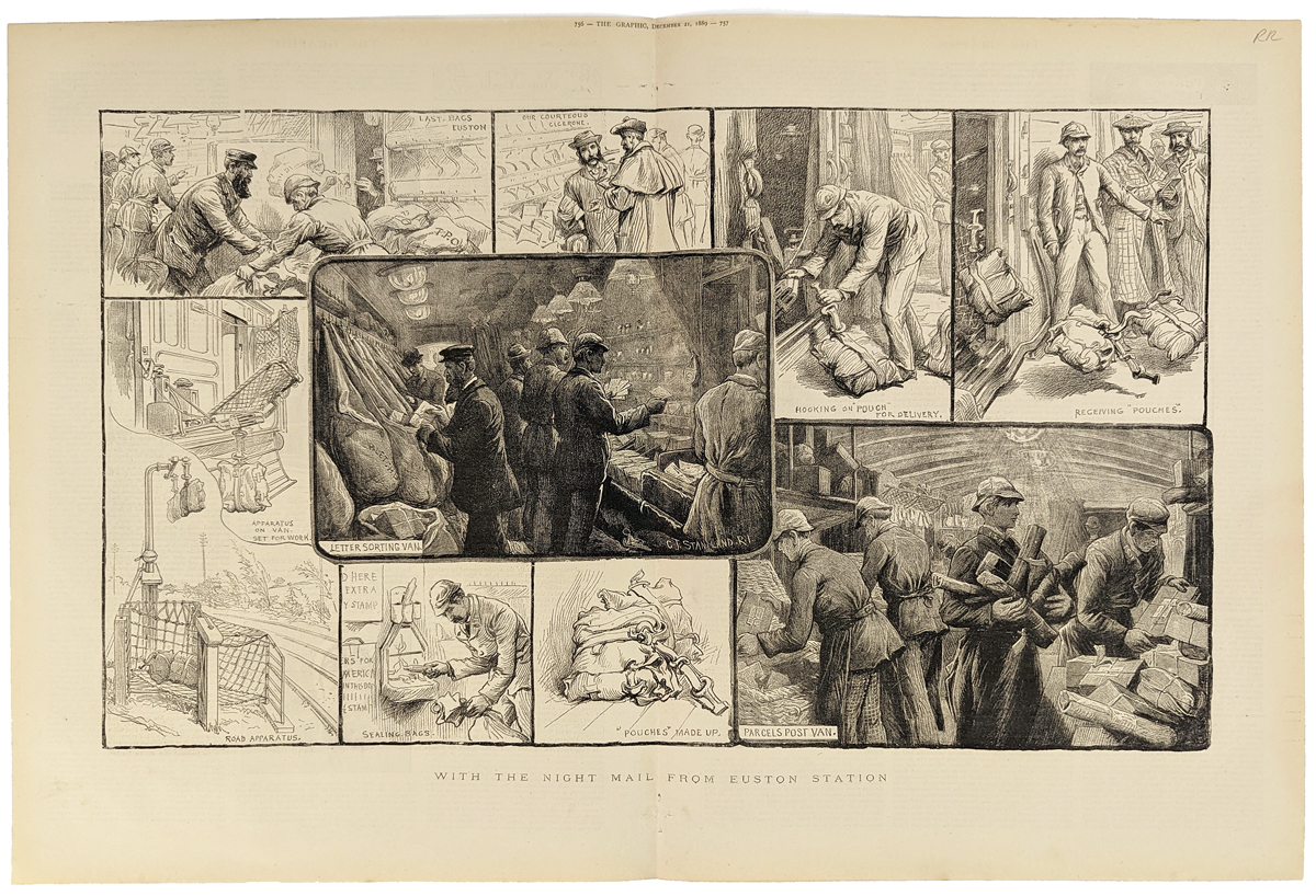 ![]() 239rr: 1889 Large Railroad Mail Print. Wood engraved print shows several scenes of mail being handled on board the train. Published in The Graphic Magazine. 16 x 23 in. $80 |