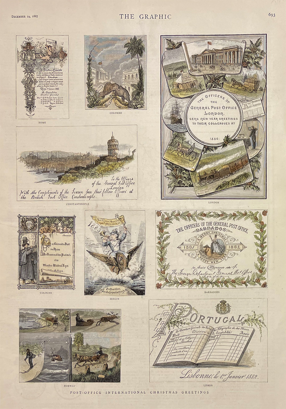 ![]() 365xmas: Post-Office International Christmas Greetings. Showing 9 greetings from Rome, Colombo, Constantinople, London, Berlin, Barbadoes, Cologne, Norway, and Libson. 1877 The Graphic. Hand colored, wood engraving. 11 1/2 x 16 in. $80 |