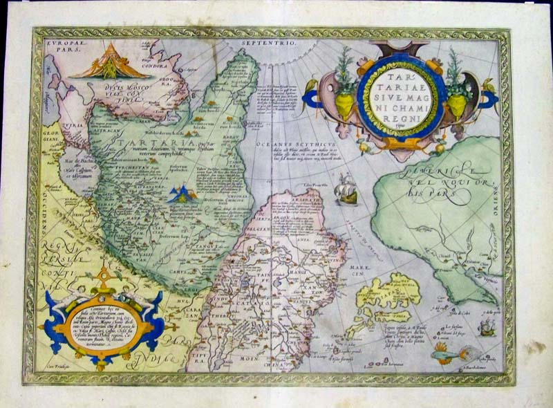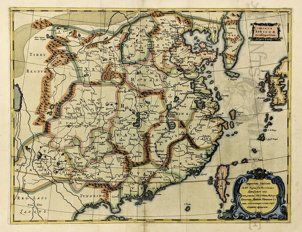 great wall and the Gobi Desert are pictured. Water colored copperplate