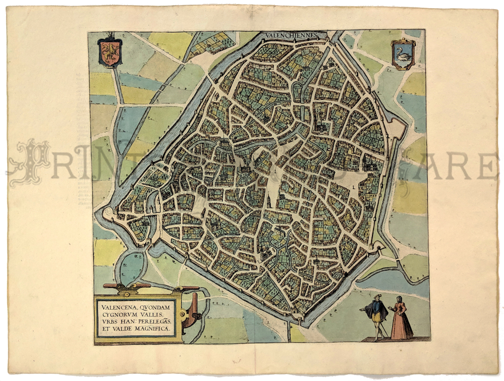 map of Valenciennes. Beautifully hand colored copper engraving.
