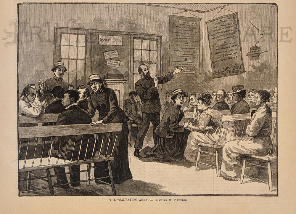 ![]() 006sal: Salvation Army – Rev Booth 1880 – “Took London by Storm.” Wood engraving. 7 ¼ x 10 in. $30 ![]() 005sal: 1882 Salvation Army Methods. Wood engraving shows soldiers from the Salvation Army soliciting and praying with recruits. Published in an 1882 issue of Frank Leslie's Illustrated Newspaper. 11x16 in. $30 SOLD |