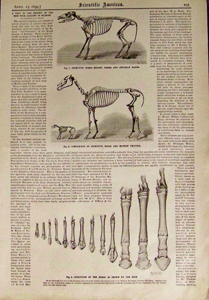 002science: 1895 Scientific American wood engraving showing the bone structure in the Evolution of the horse in three images. Text included on page. 16 x 11 in. $30