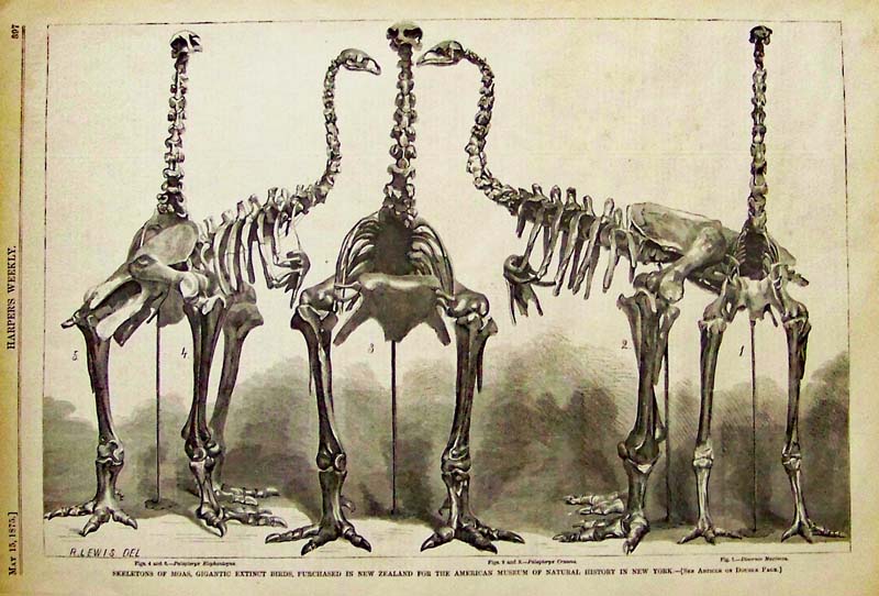 003science: 1875 Harper's Weekly wood engraving showing Skeletons of Moas, Gigantic Birds, Purchased in New Zealand for the American Museum of Natural History in New York. 15-1/2 x 11 in. $40