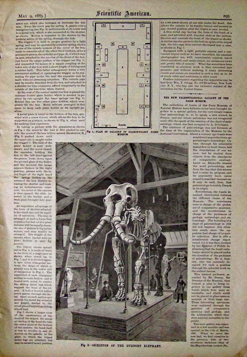 004science: 1885 Scientific American wood engraving surrounded by text showing in Figure 1, a Plan of Gallery of Paleontology, Paris Museum; and in Figure 2, a Skeleton of the Durfort Elephant. 15-1/2 mx 11 in. $30