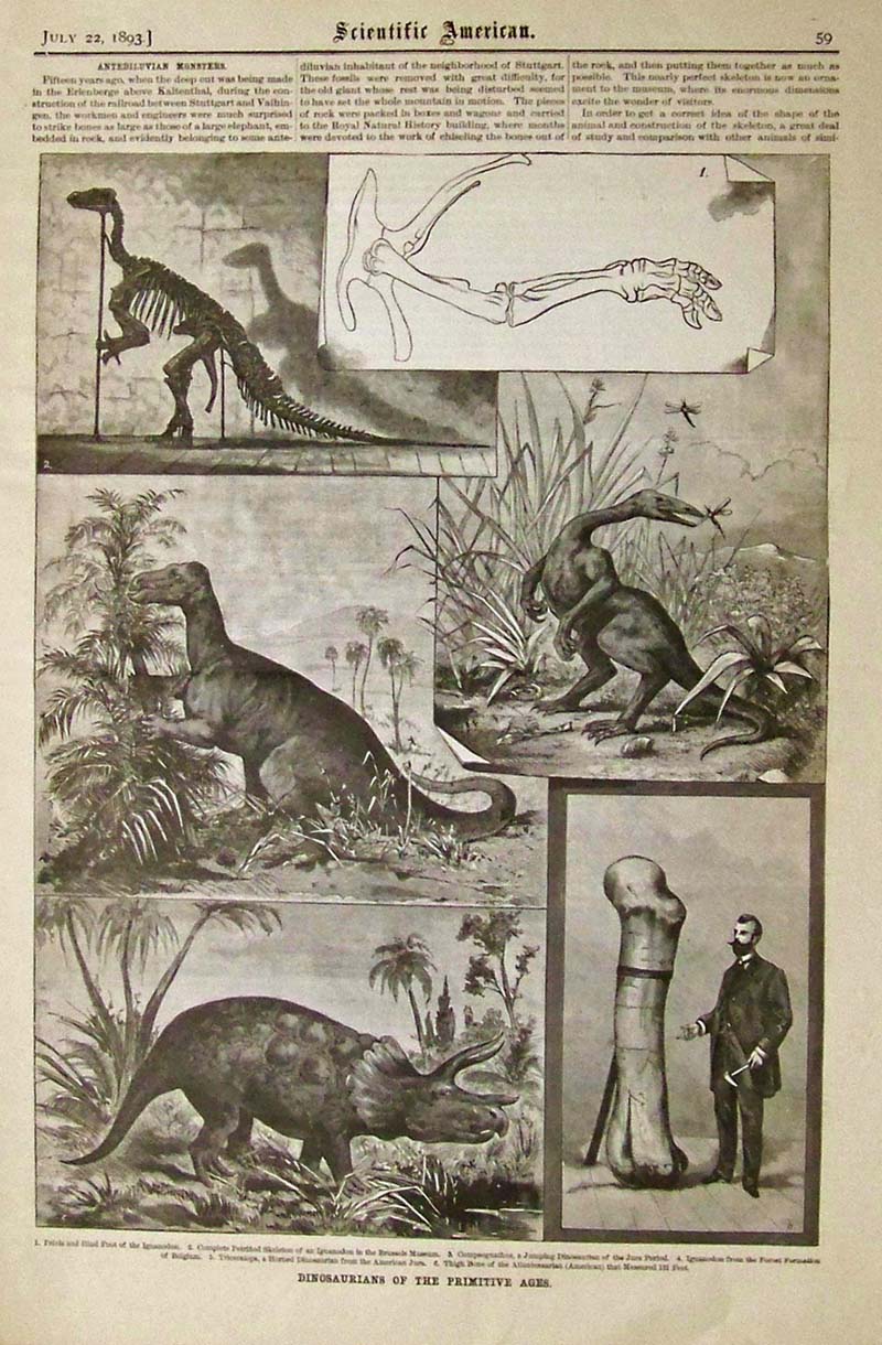 005science: 1893 Scientific American wood engraving showing several images of Dinosaurians of the Primitive Ages. The last image bottom right shows how gigantic the thigh bone of the Atlantosaurian (American) compared to a man. It measured 131 Feet in length. 16 x 11 in. $40