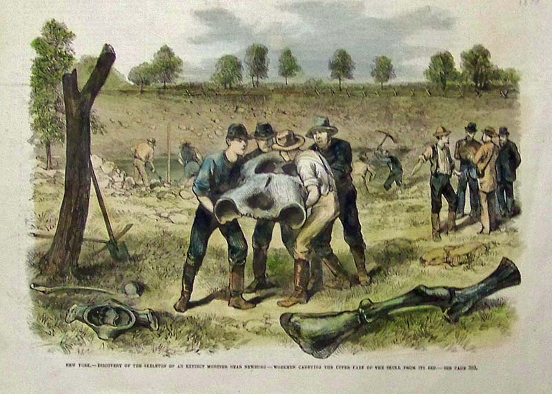 006science: 1879 Hand colored wood engraving showing the Discovery of the Skeleton of an Extinct Monster near Newburg and Workmen carrying the Upper Part of the skull from its Bed; New York. 11 x 8 in. $60