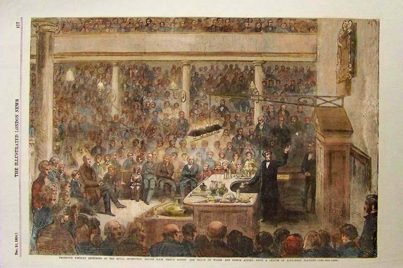 007science: 1856 Hand colored wood engraving featured in The Illustrated London News showing Professor Faraday lecturing at the Royal Institution, Before H.R.H. Prince Albert, the Prince of Wales and Prince Alfred. 16 x 11 in. $60