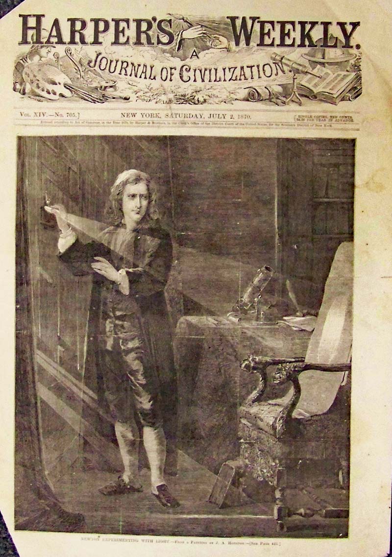 009science: 1870 Wood engraving showing Isaac Newton experimenting with light. This was featured in Harper's Weekly, A Journal of Civilization. 16 x 11 in. $30