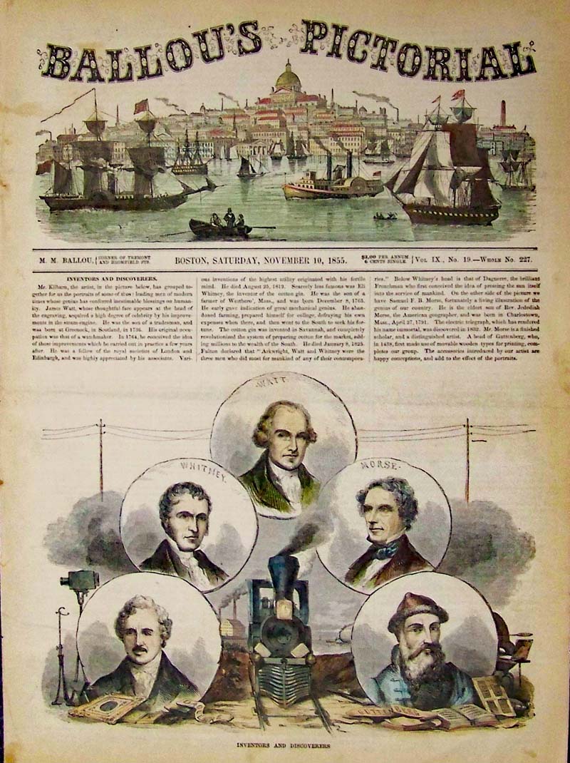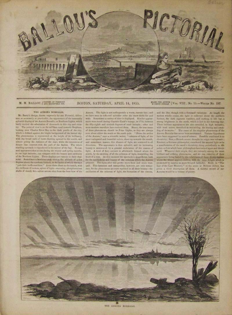 016science: 1855 Ballou's Pictorial wood engraving showing The Aurora Borealis in bottom image. 14-1/2 x 10-1/2 in. $30