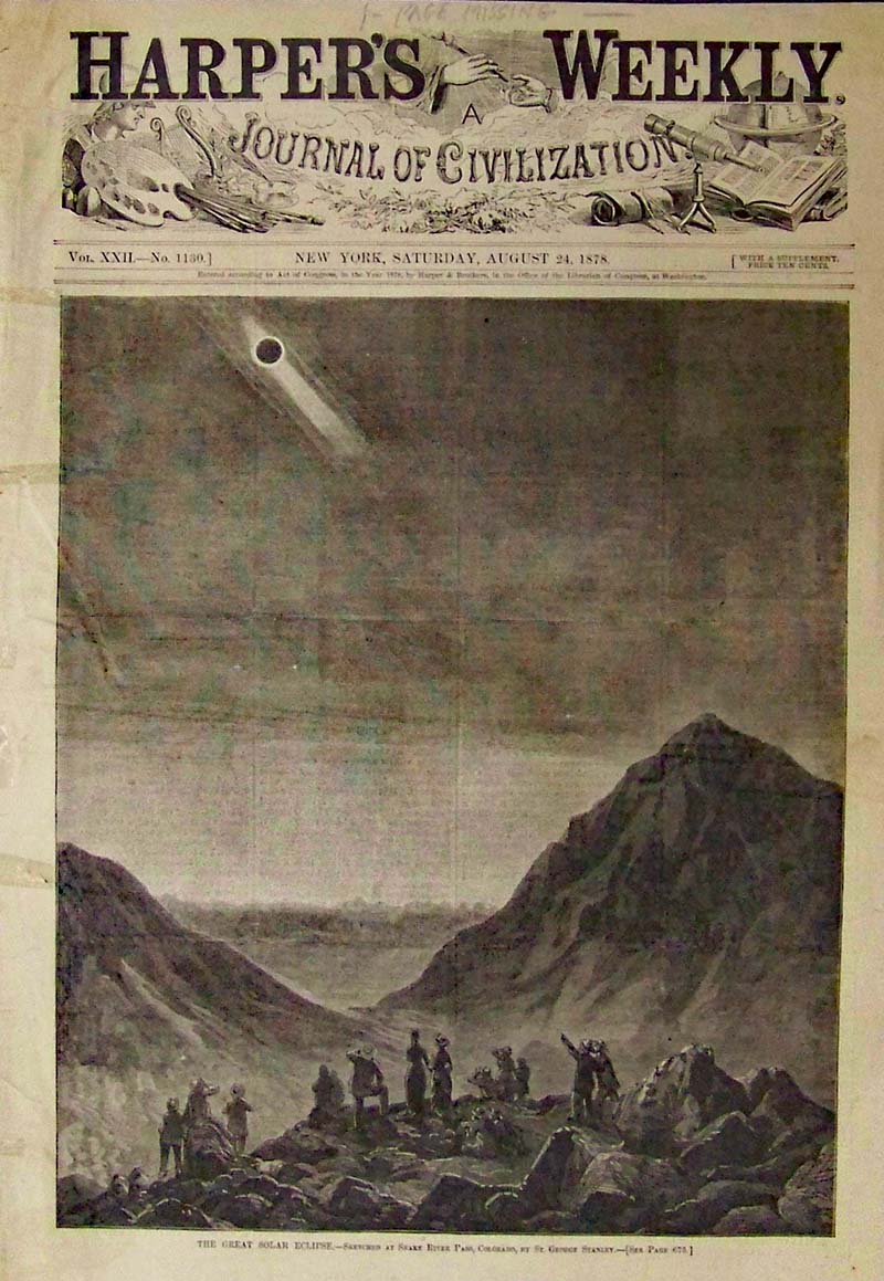 017science: 1878 Wood engraving showing the Great Solar Eclipse which was sketched for Harper's Weekly, A Journal of Civilization at Snake River Pass. Colorado, by St. George Stanley. 15 x 10-1/2 in. $50