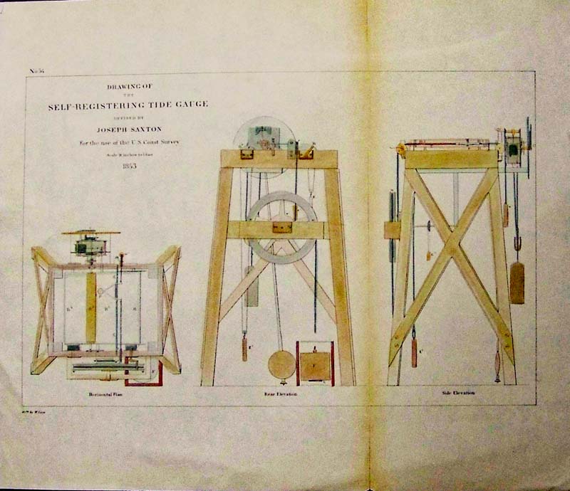019science: 1853 Hand colored copper engraved Drawing of the Self-Registering Tide Gauge Devised by Joseph Saxton for the use of the U.S. Coast Survey. Three diagrams are shown. 12-1/2 x 10-1/2 in. $60